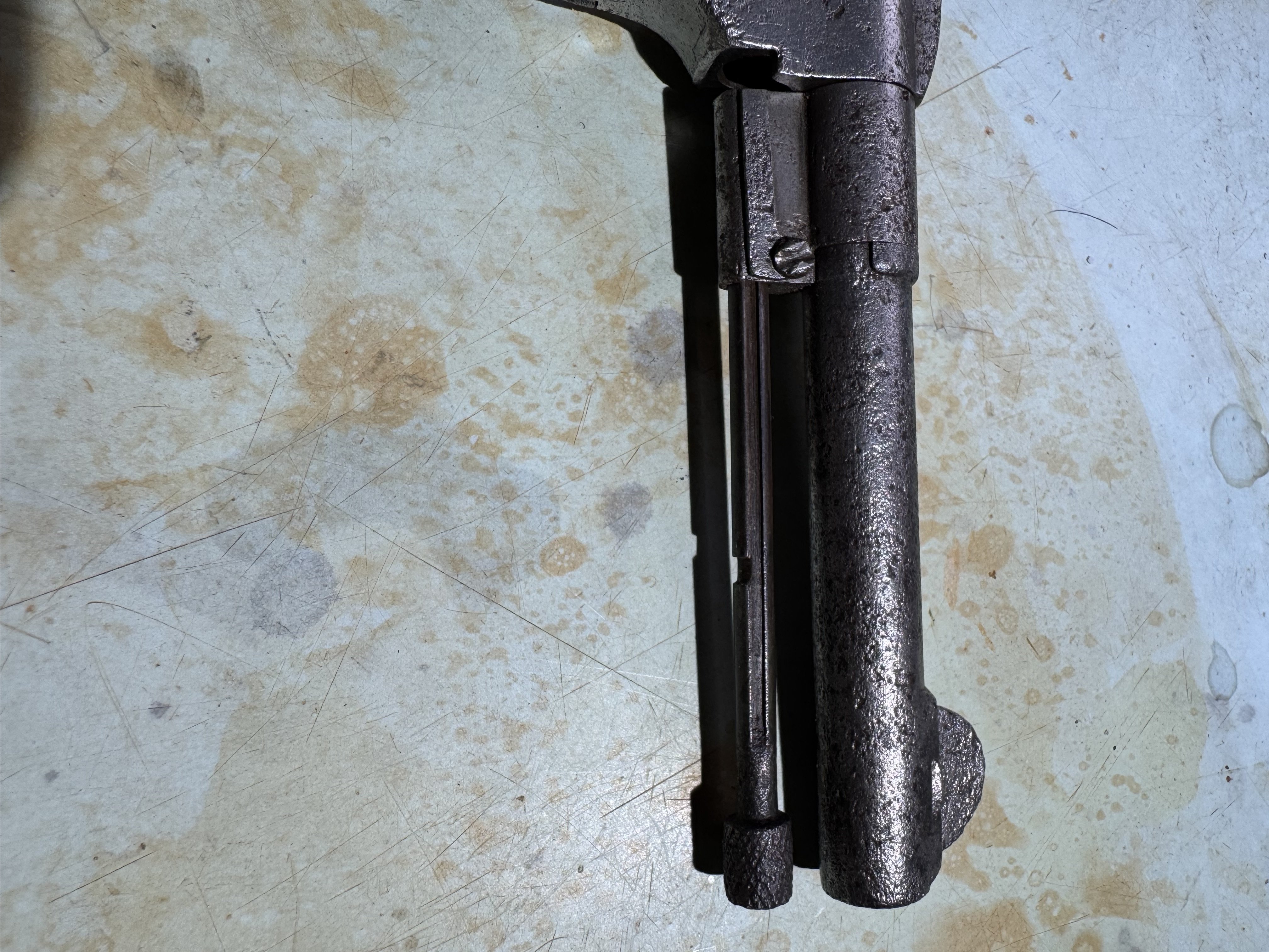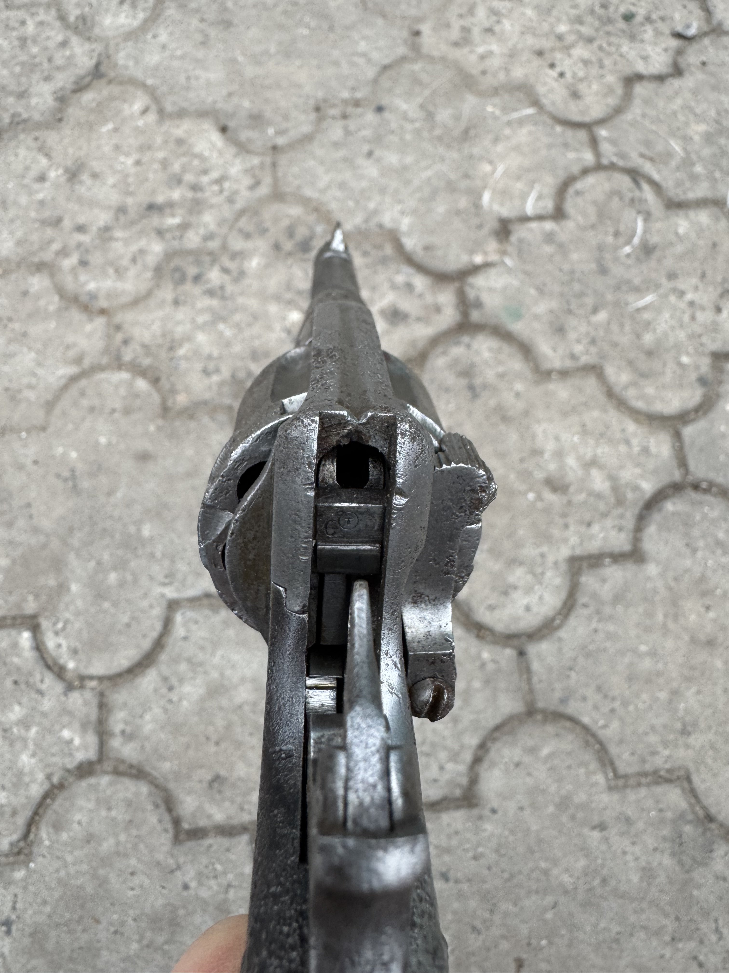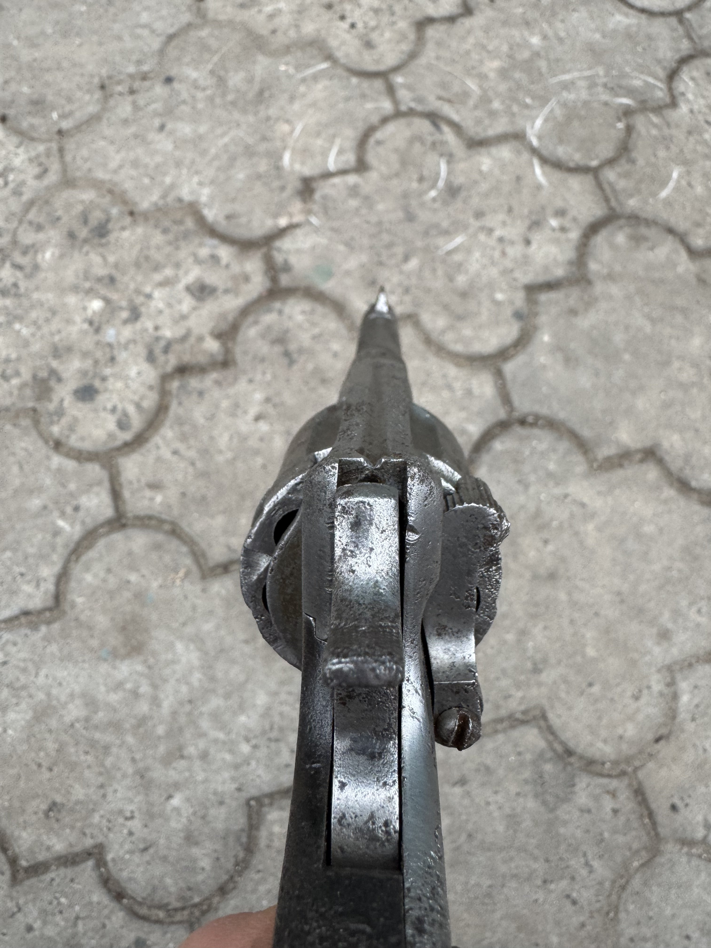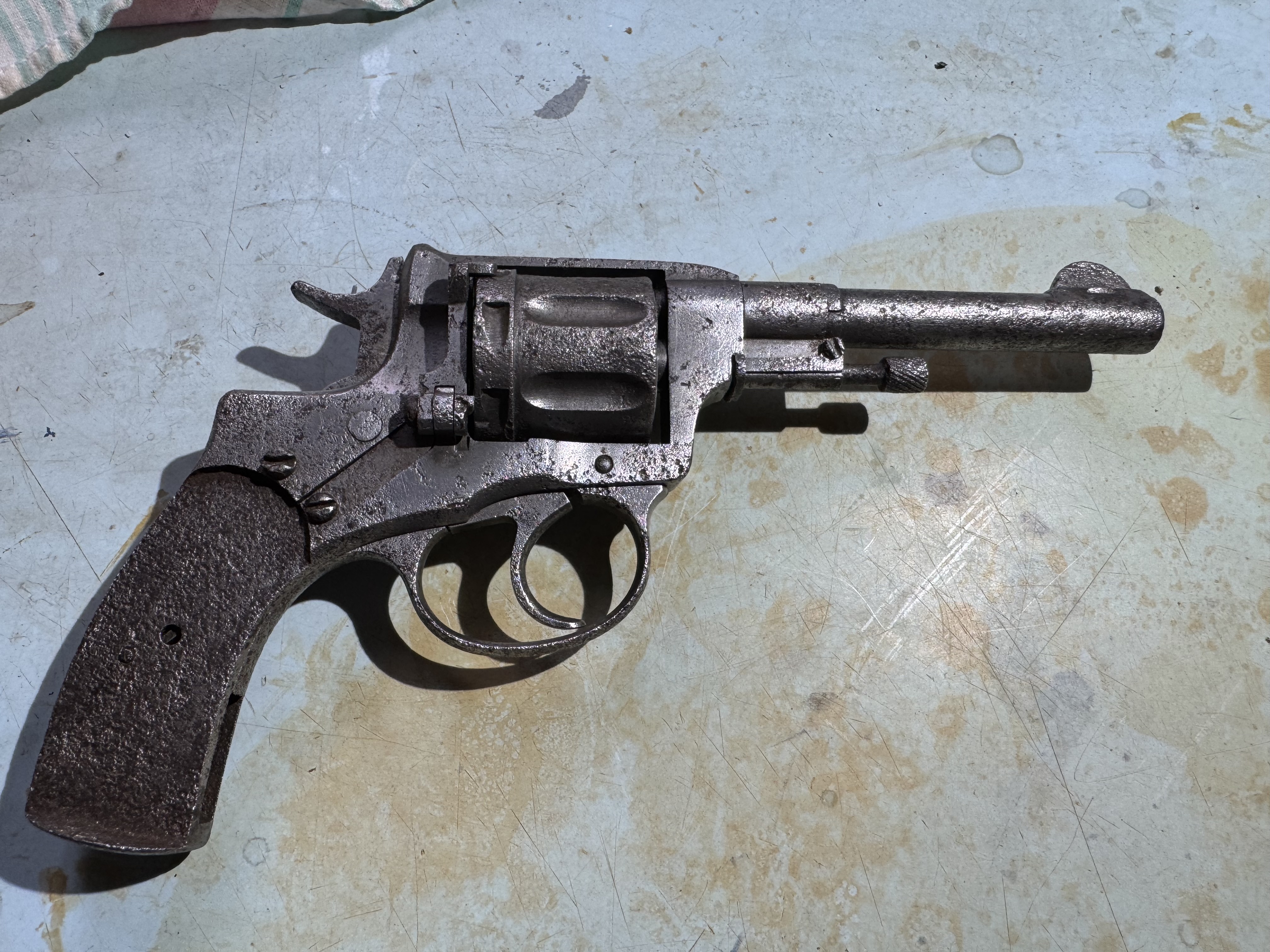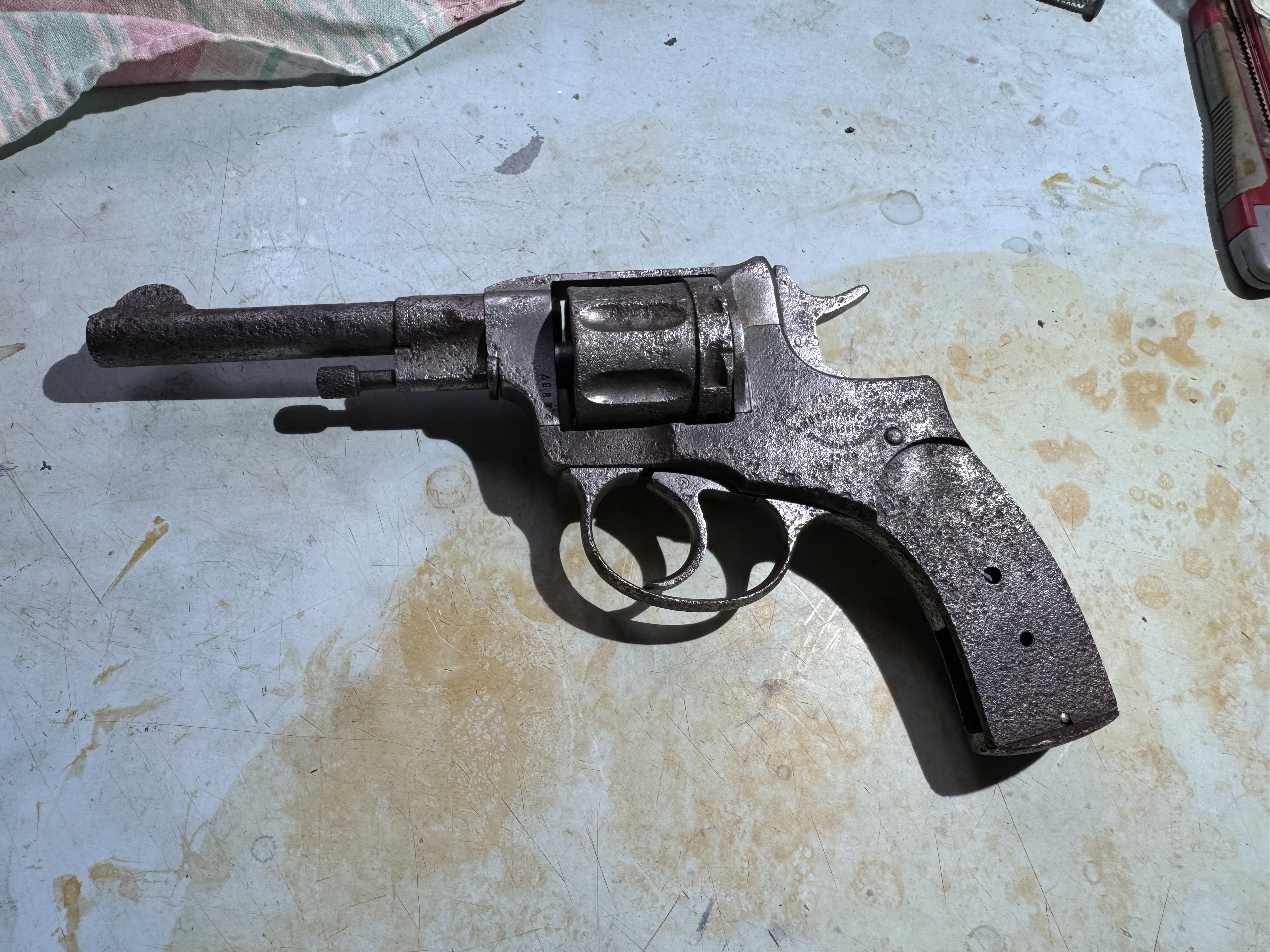 Вітаю.Знахідка з горища.Трохи був підчищений накладки розламались.Спробували підворонить накладку та шомпол.Весь на одному номері,видно що ремонтувався в ті часи.Нарізи проглядуються слабенько,до чистки спуск був у синьому воронінні.При продажі ствол буде залитий мʼякиим металом.Все працює штатно при провертання барабана приємне тріскотіння.Скільки може коштувати?