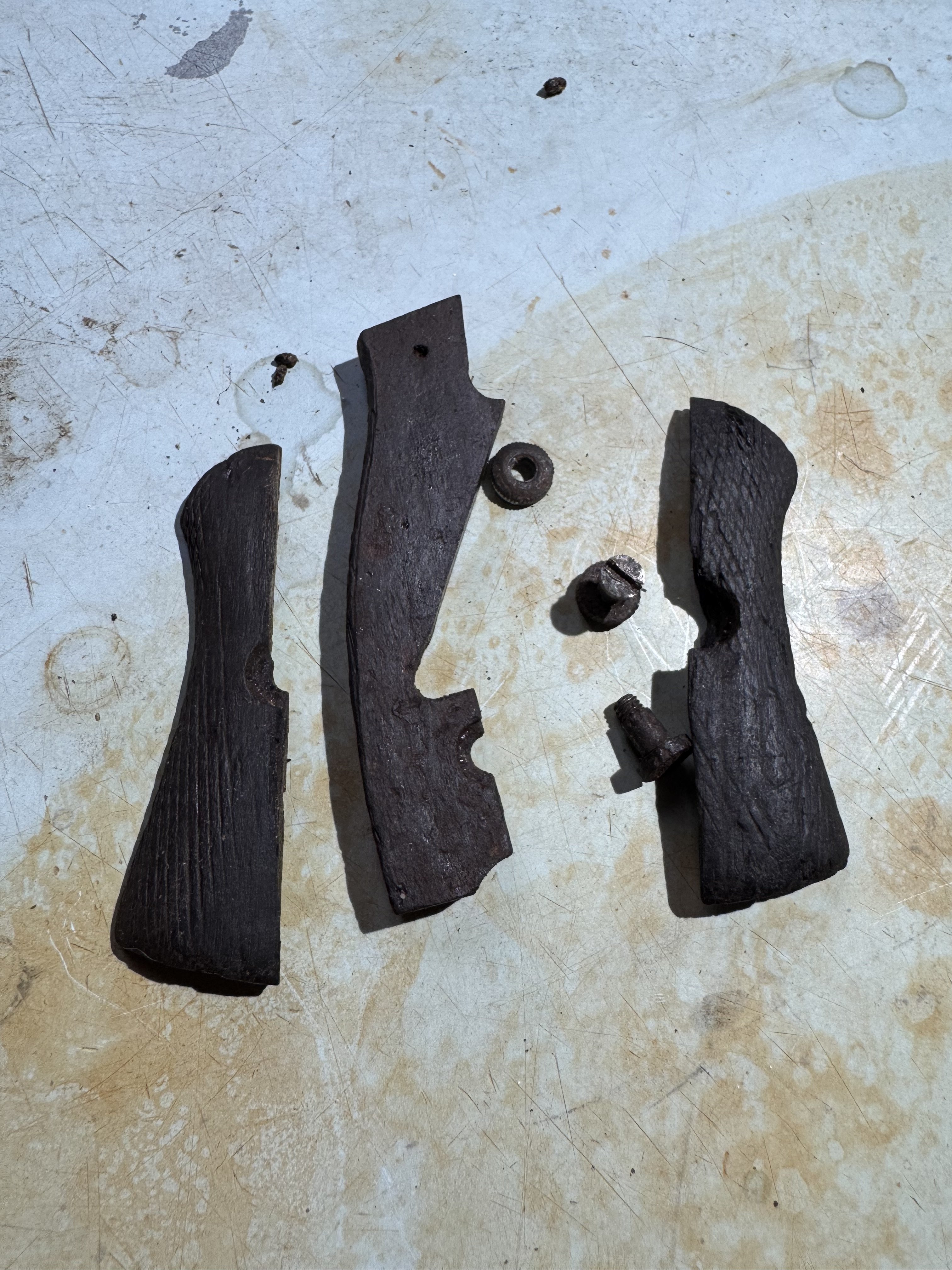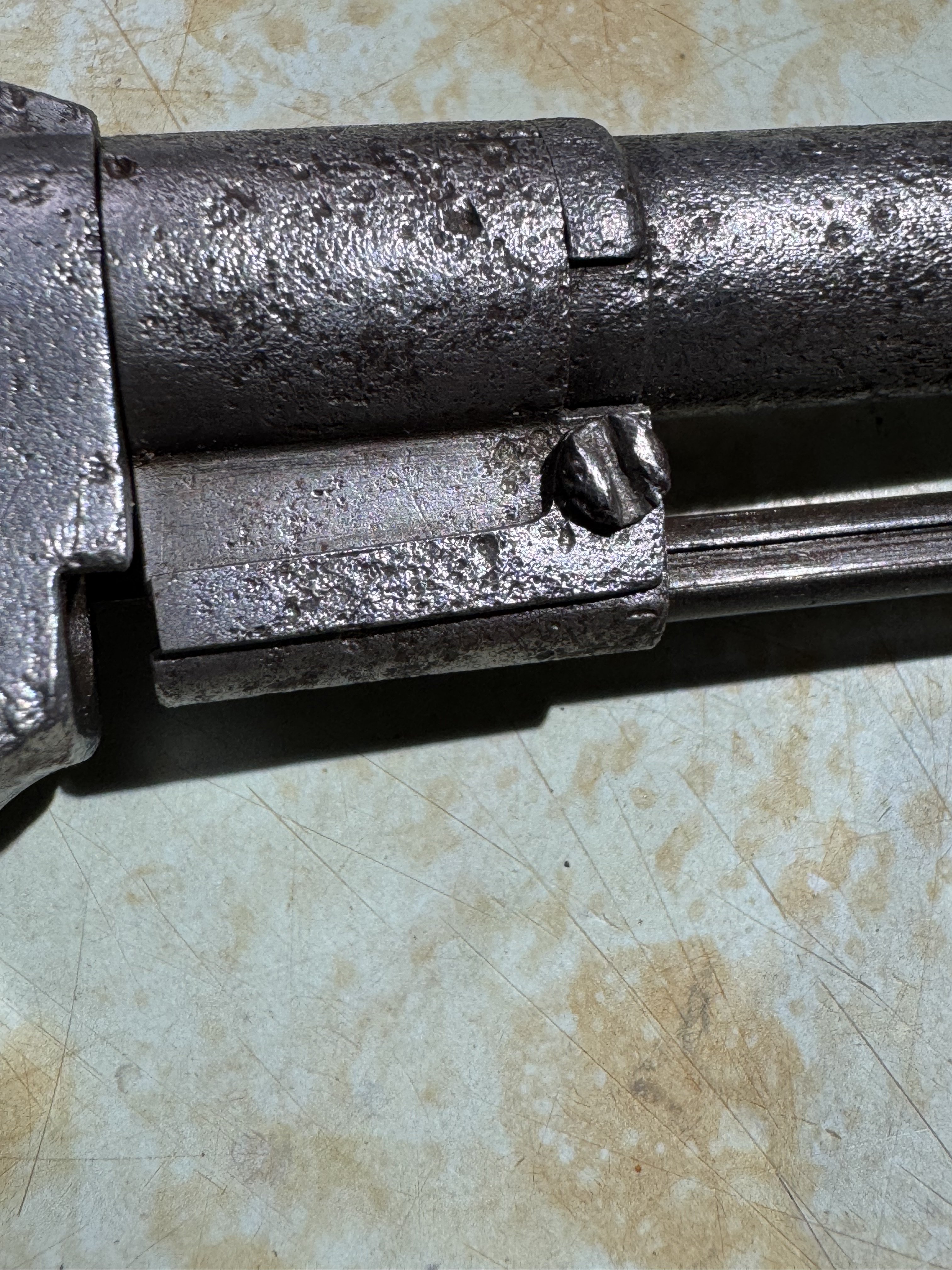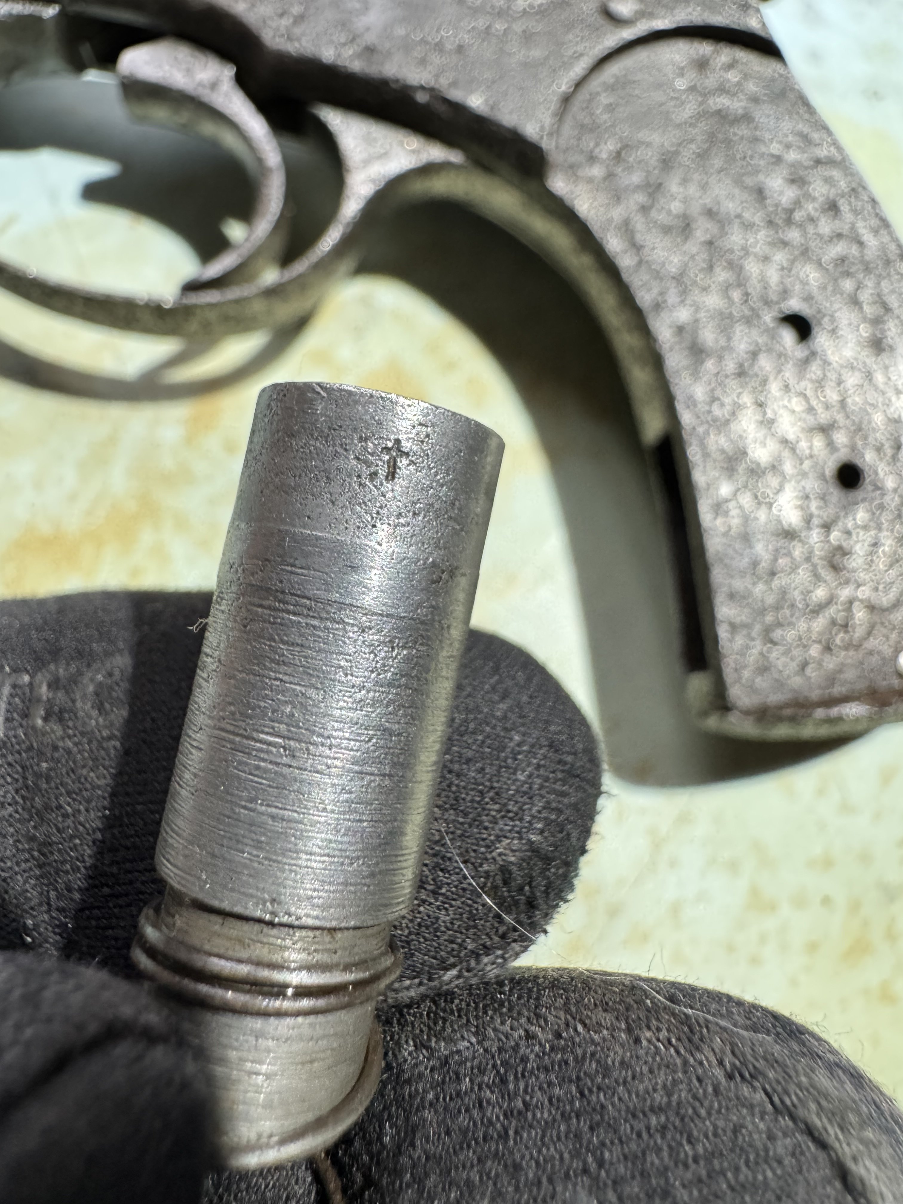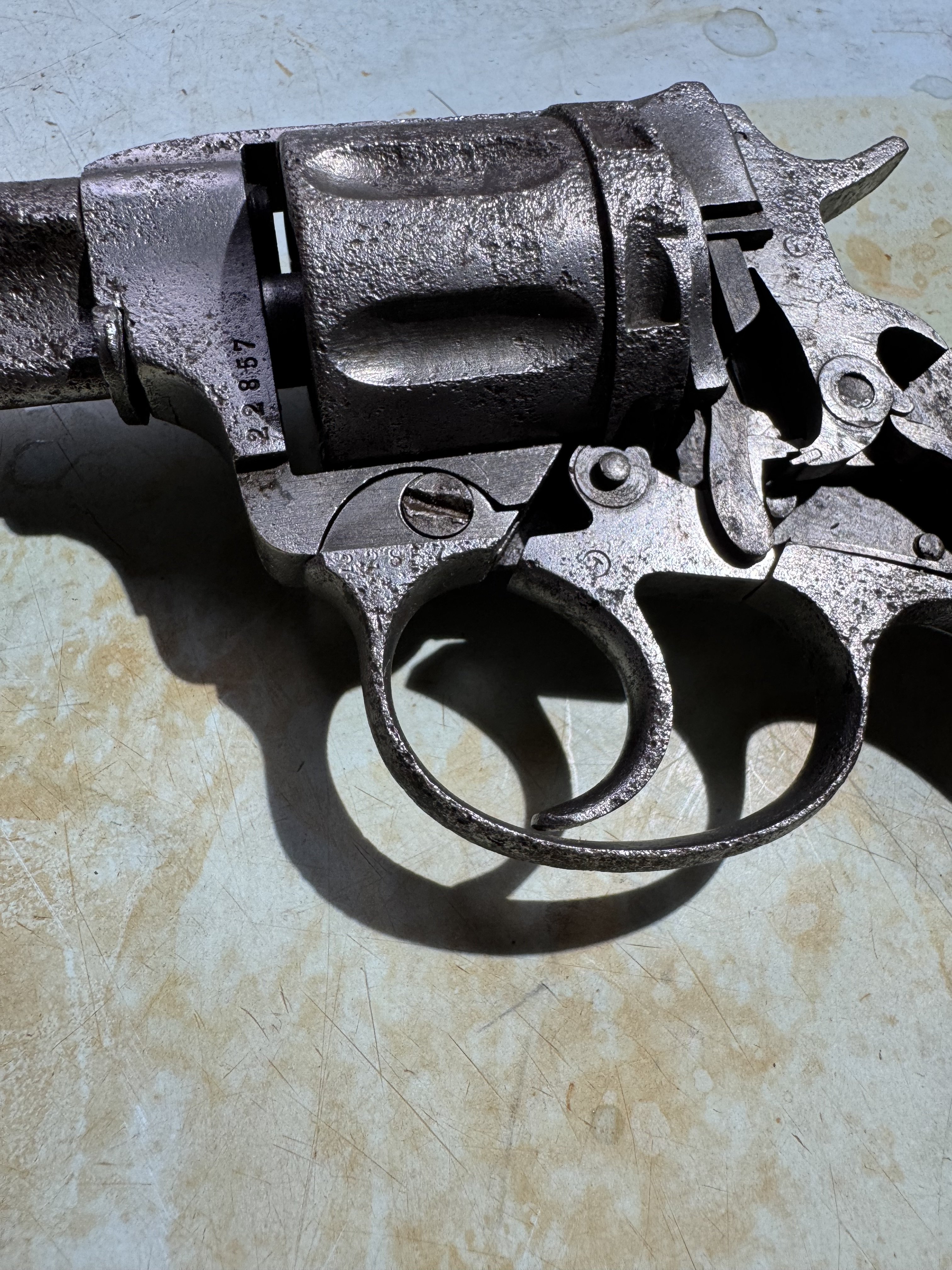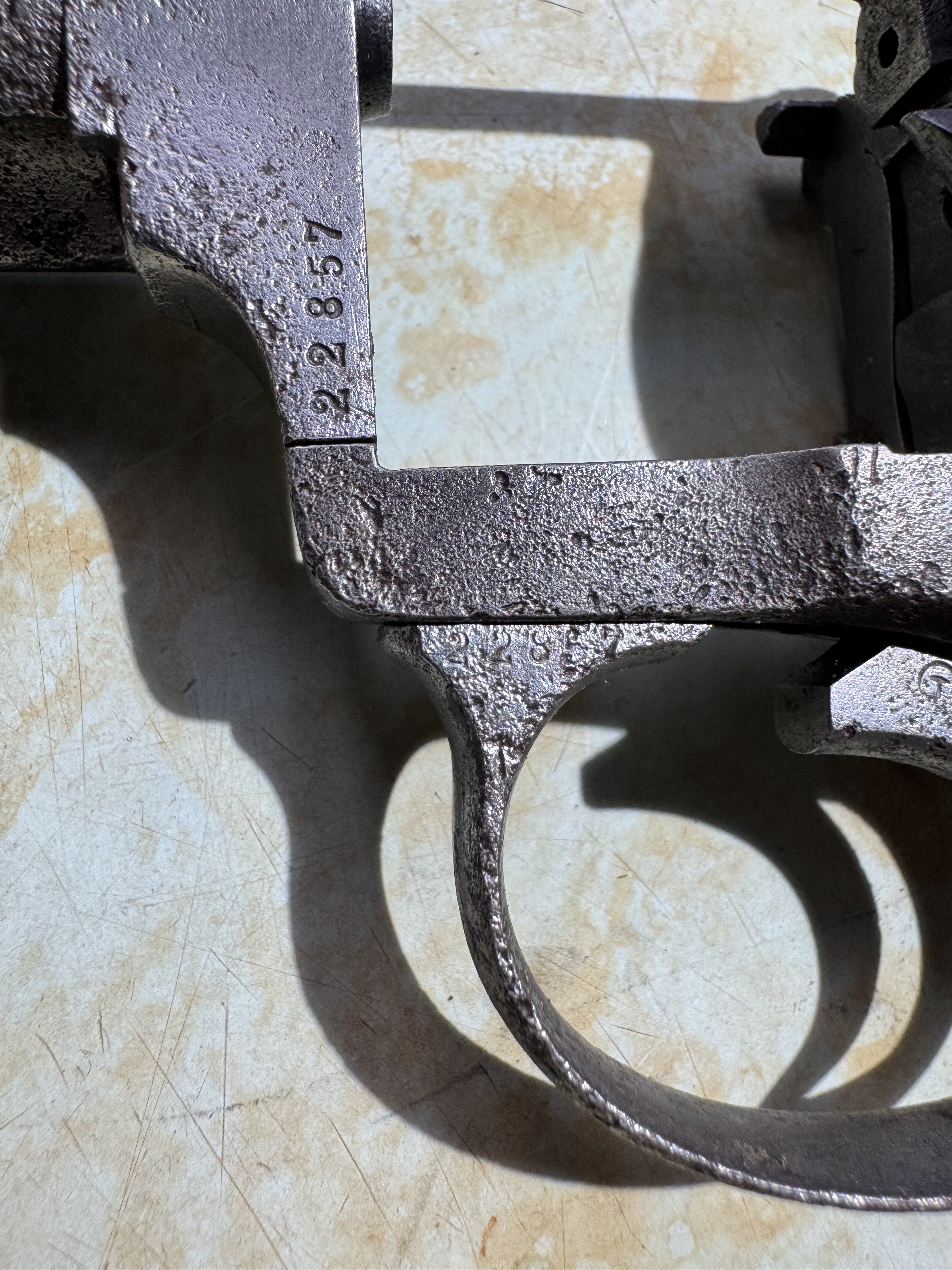 Вітаю.Знахідка з горища.Трохи був підчищений накладки розламались.Спробували підворонить накладку та шомпол.Весь на одному номері,видно що ремонтувався в ті часи.Нарізи проглядуються слабенько,до чистки спуск був у синьому воронінні.При продажі ствол буде залитий мʼякиим металом.Все працює штатно при провертання барабана приємне тріскотіння.Скільки може коштувати?