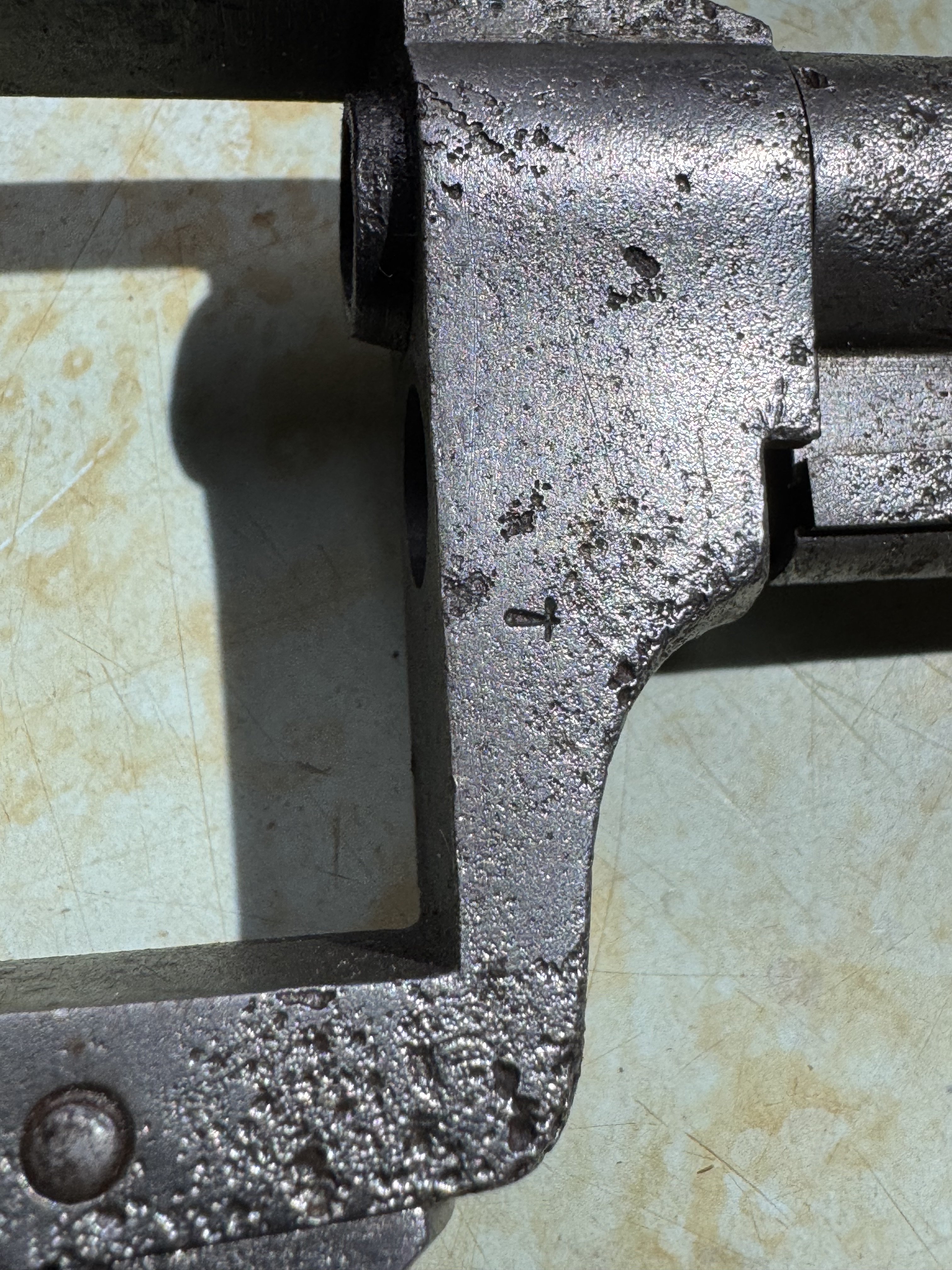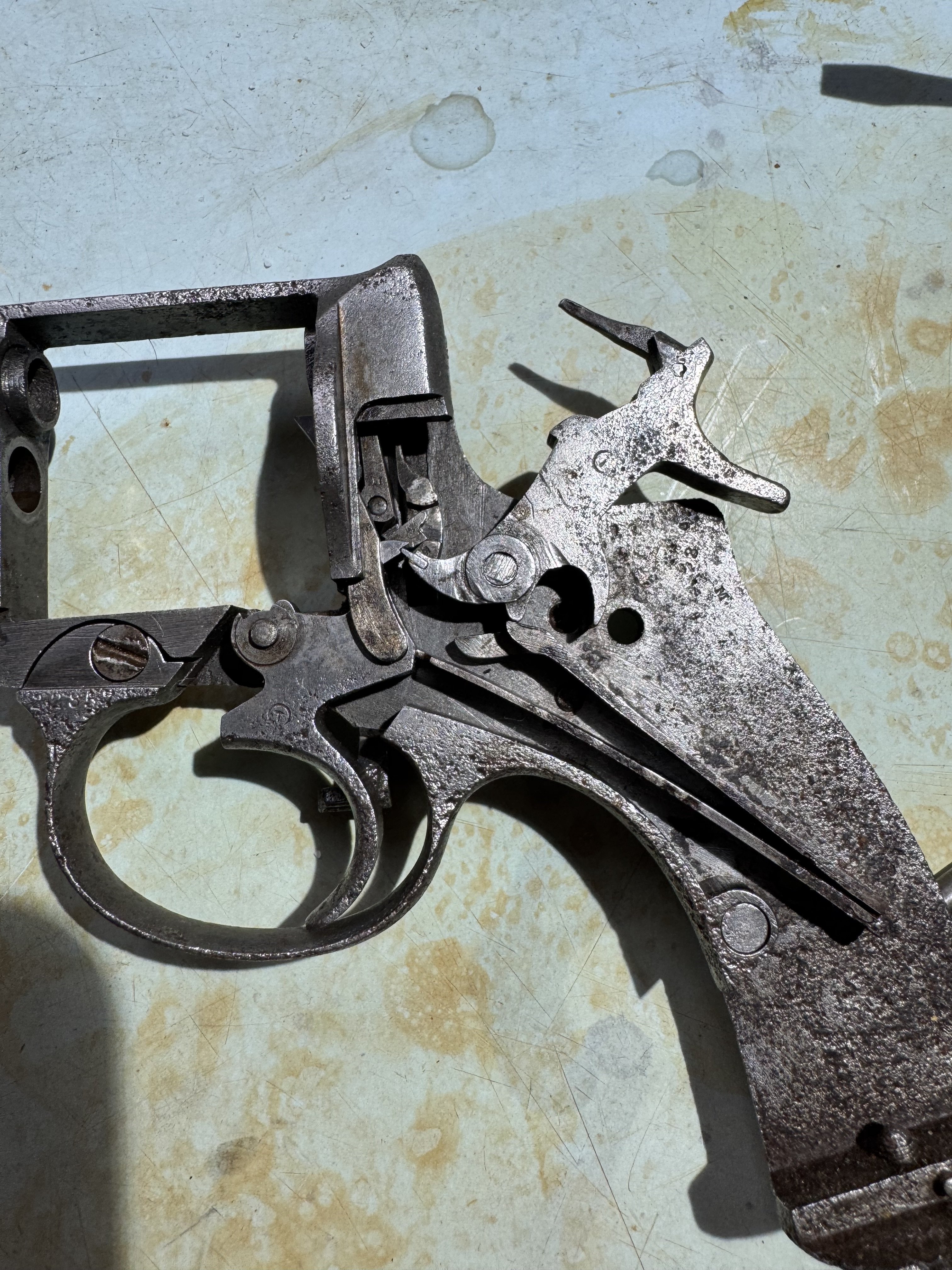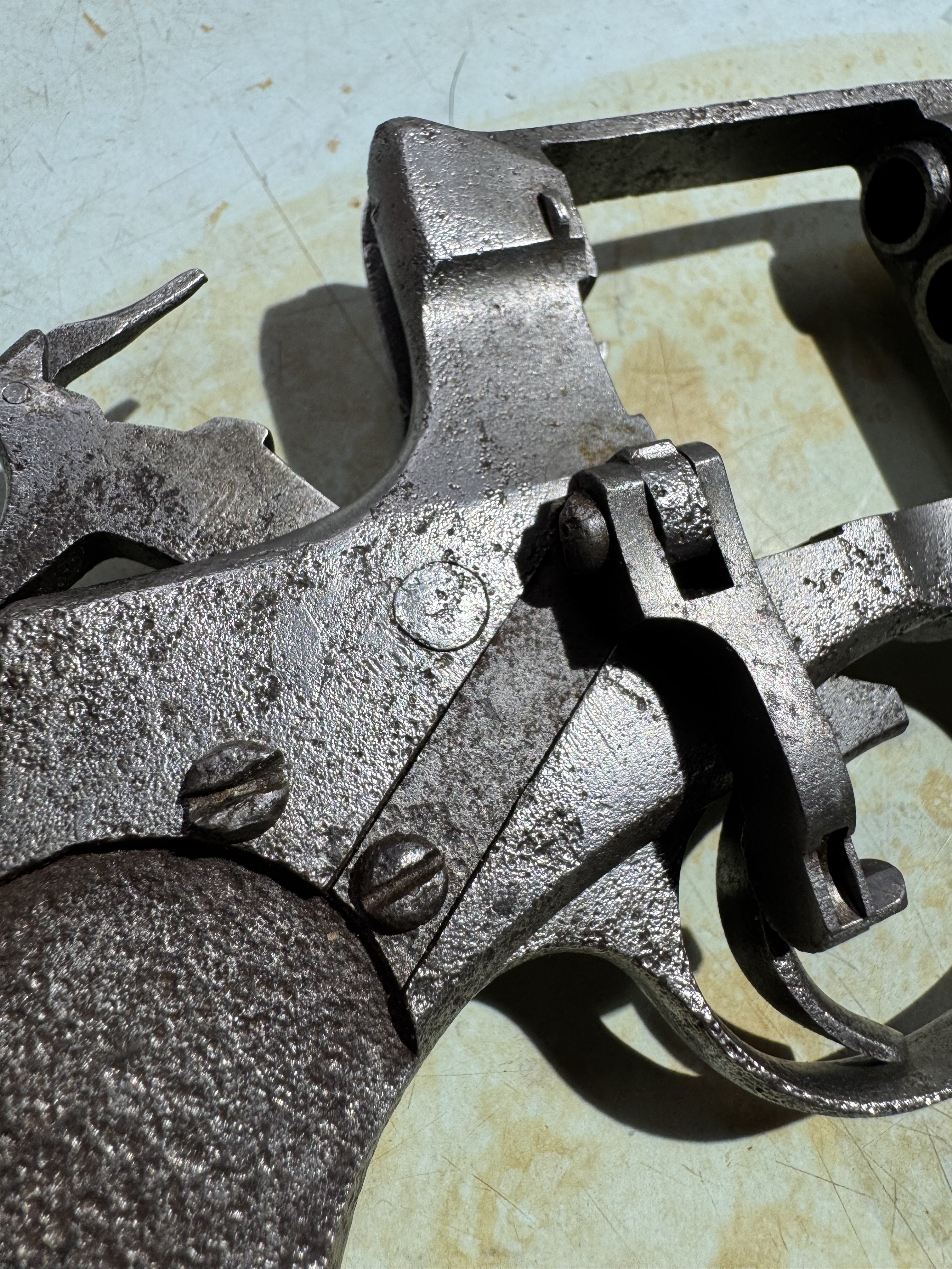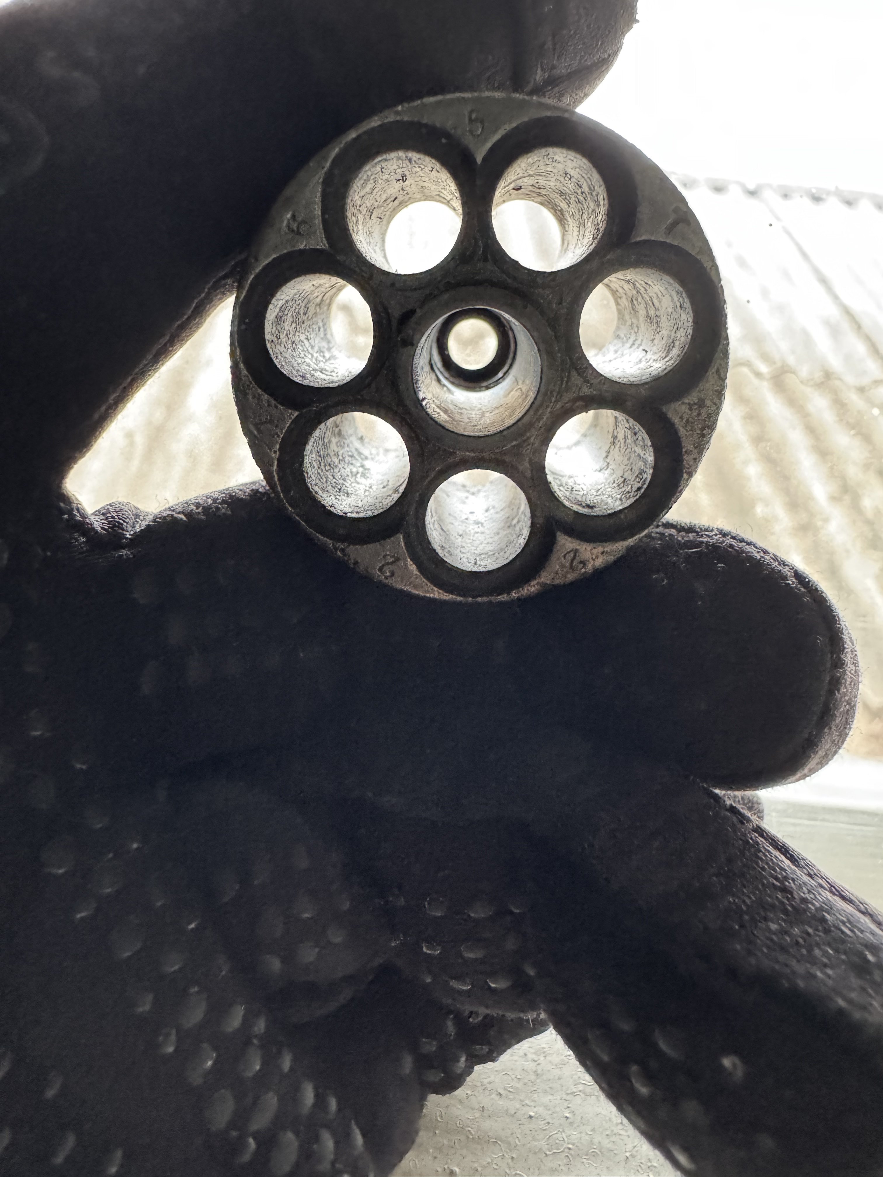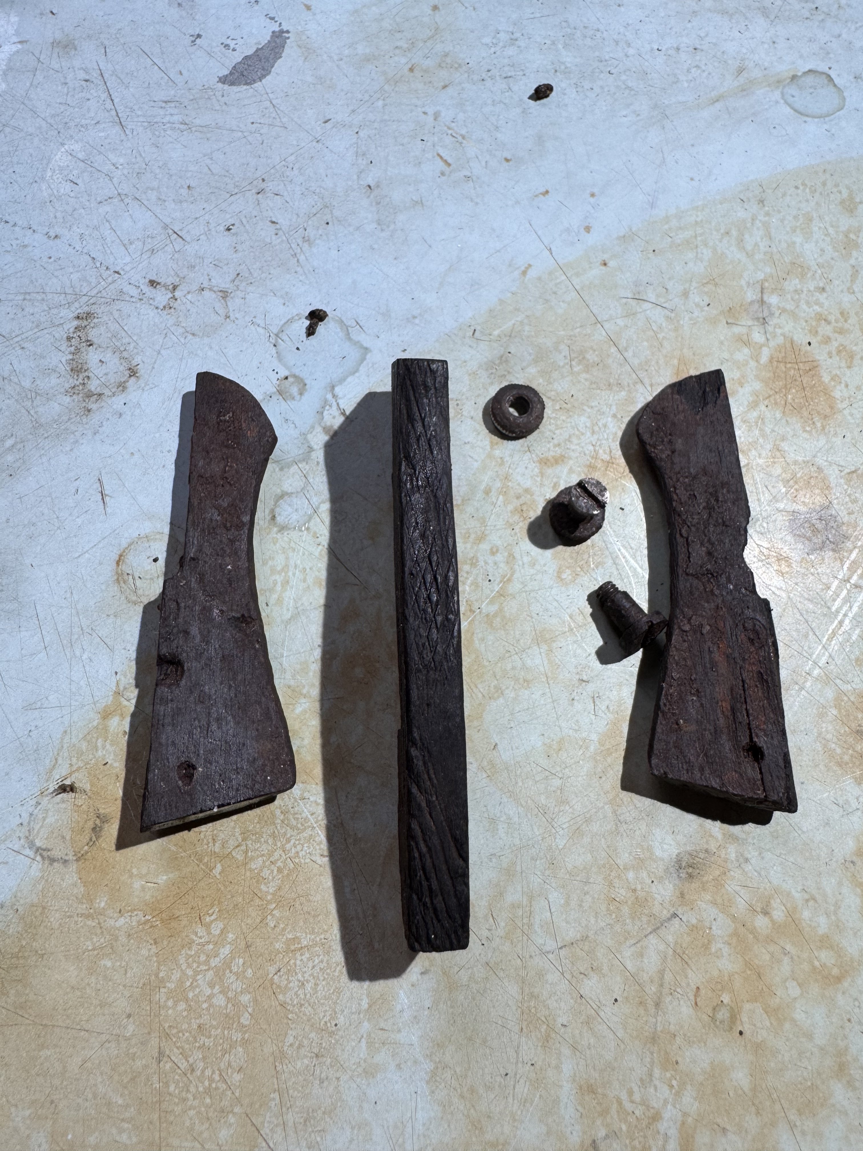 Вітаю.Знахідка з горища.Трохи був підчищений накладки розламались.Спробували підворонить накладку та шомпол.Весь на одному номері,видно що ремонтувався в ті часи.Нарізи проглядуються слабенько,до чистки спуск був у синьому воронінні.При продажі ствол буде залитий мʼякиим металом.Все працює штатно при провертання барабана приємне тріскотіння.Скільки може коштувати?