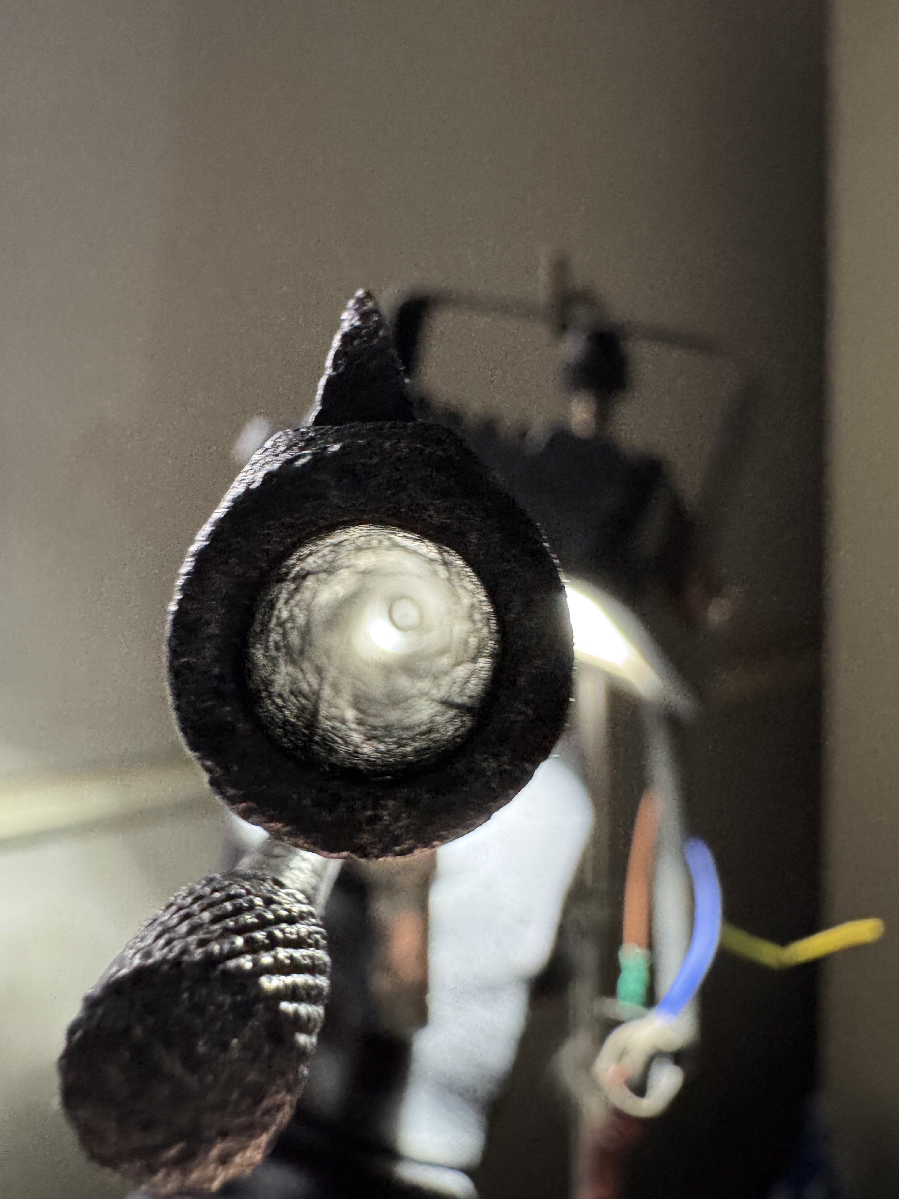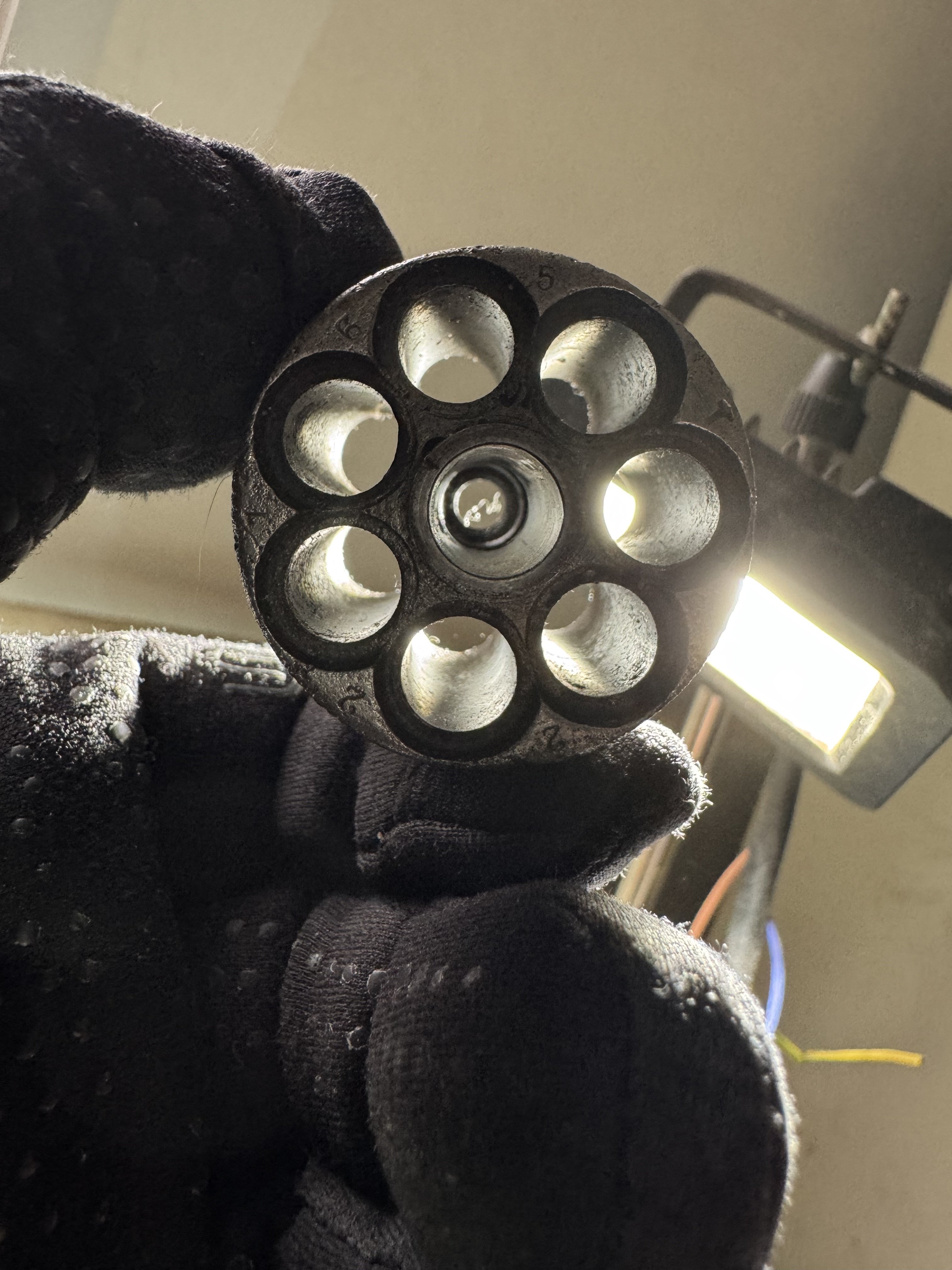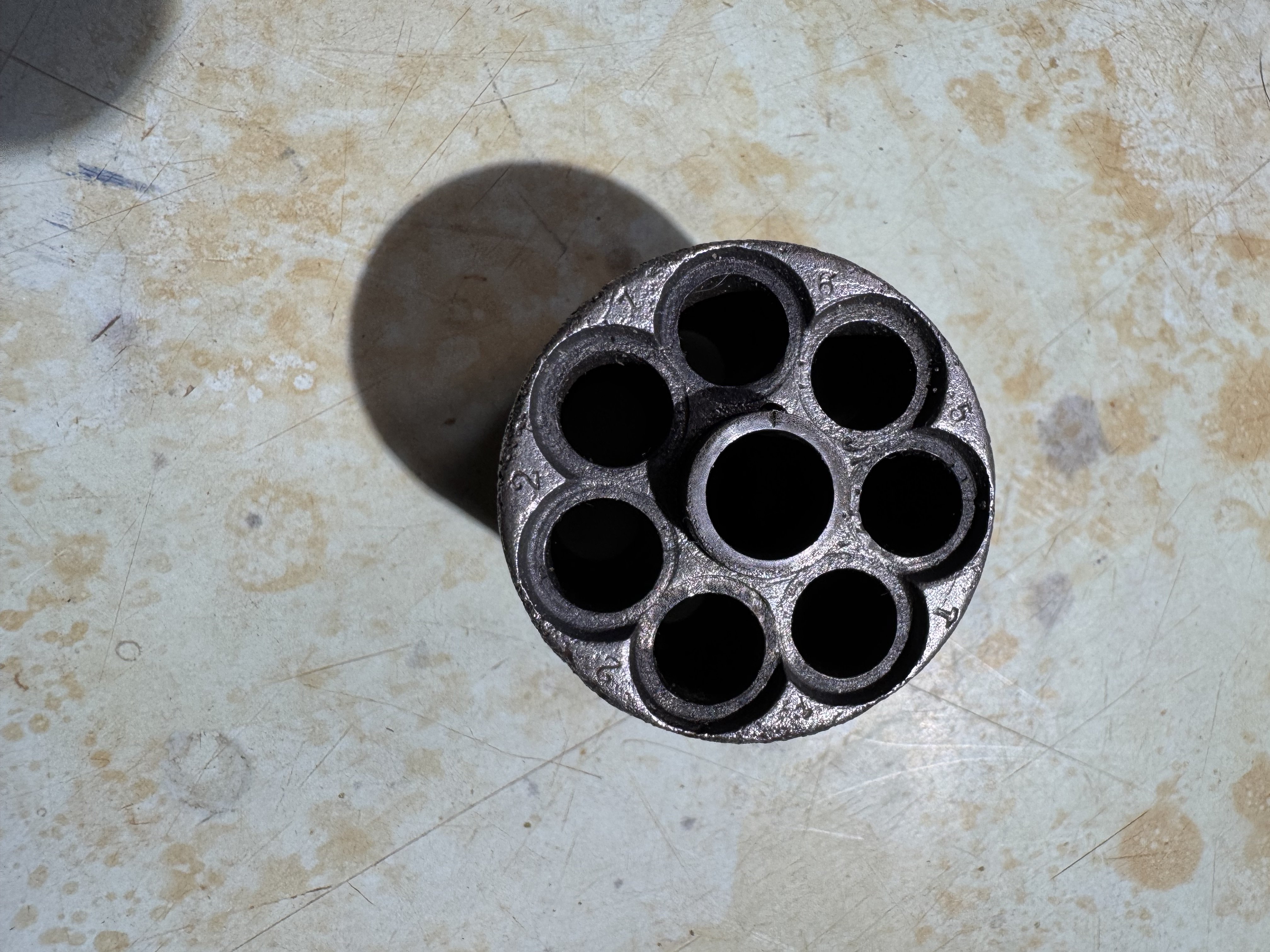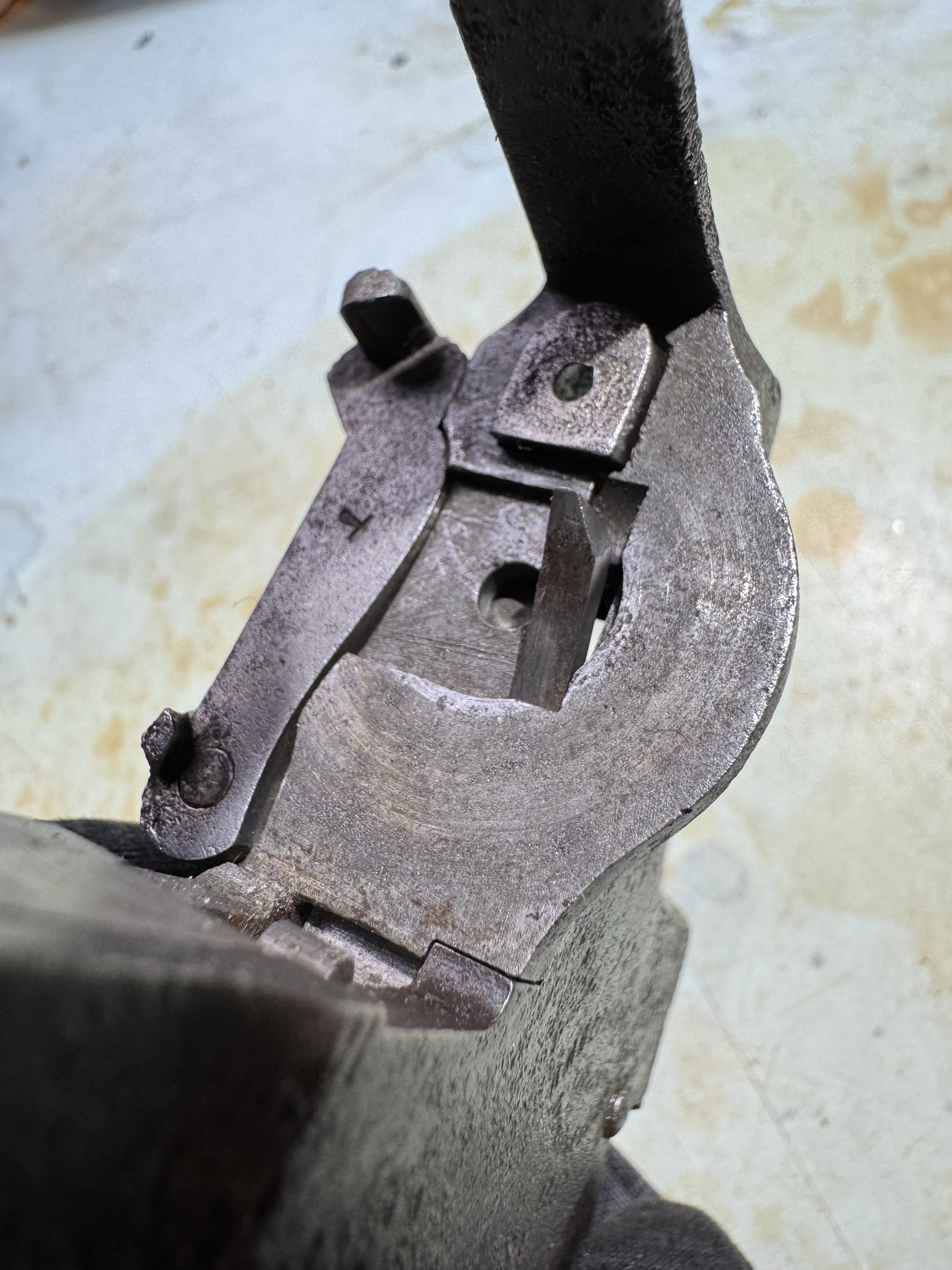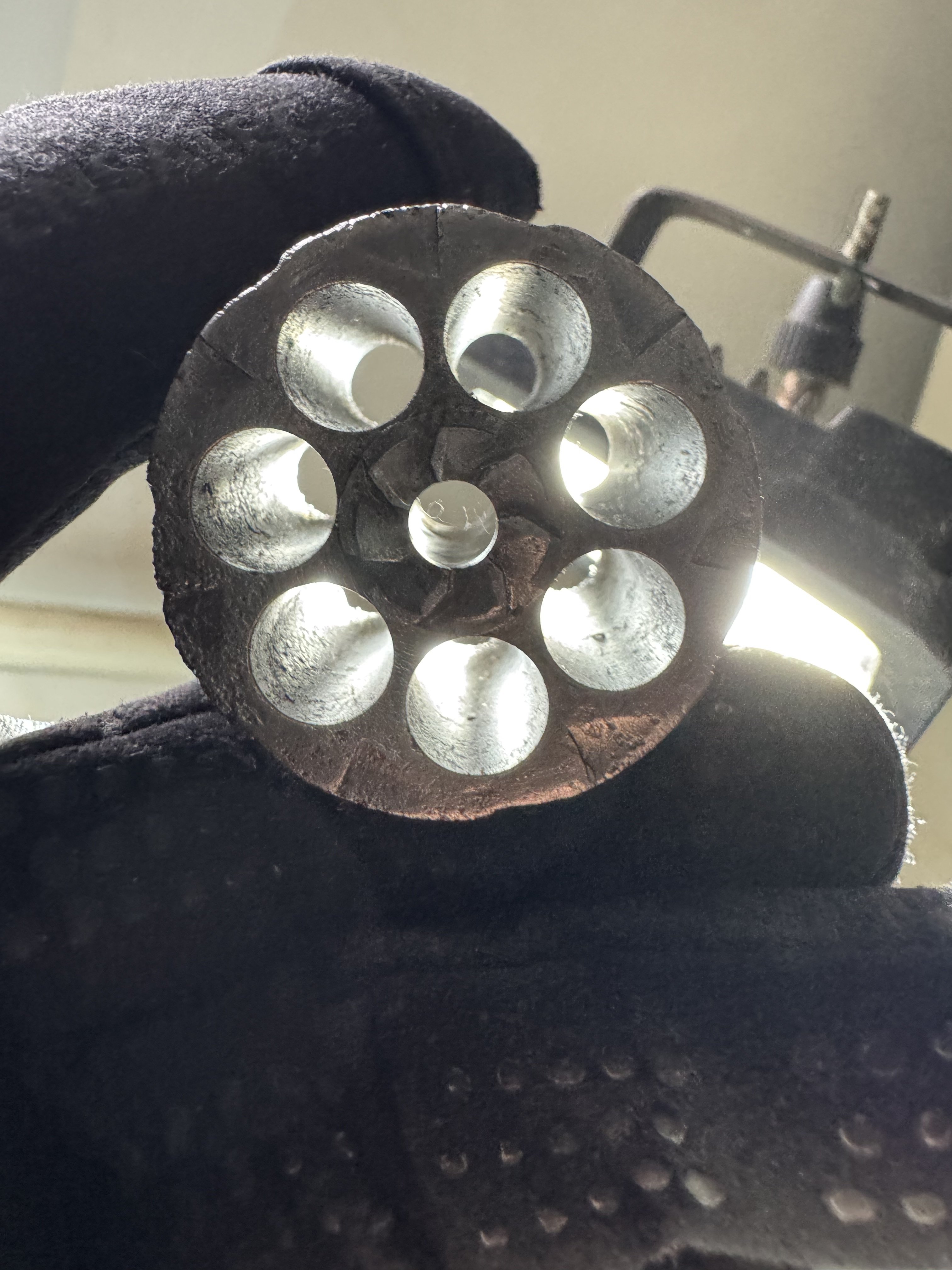 Вітаю.Знахідка з горища.Трохи був підчищений накладки розламались.Спробували підворонить накладку та шомпол.Весь на одному номері,видно що ремонтувався в ті часи.Нарізи проглядуються слабенько,до чистки спуск був у синьому воронінні.При продажі ствол буде залитий мʼякиим металом.Все працює штатно при провертання барабана приємне тріскотіння.Скільки може коштувати?