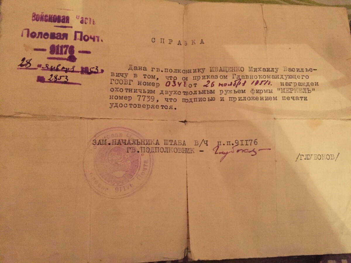 А что Вас именно интересует ? Да и тему Вы както не в том разделе создали. По ружью не знаю. А вот полковник на момент награждения служил в Группе Советских Окупационых Войск в Германии ( ГСОВГ) . + принимал активное участие в ВОВ. http://podvignaroda.ru/?#tab=navResult С ув.
