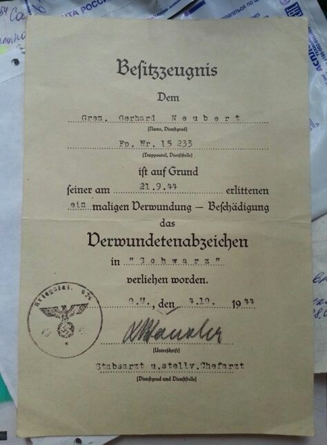Очень плохой скан. Это не золотое (3 степени), а чёрное (1 степени) ранение. ФПН: (Mobilmachung-1.1.1940) Stab I Landwehr- Infanterie-Regiment 40, (2.1.1940-27.4.1940) Stab I u. 1.-4. Kompanie Infanterie-Regiment 335, (25.1.1943-31.7.1943) gestrichen, (1.8.1943-23.3.1944) 16.3.1944 4. Schwadron Divisions-Füsilier-Bataillon (A.A.) 168, (24.3.1944-6.11.1944) 19.5.1944 4. Schwadron Divisions-Füsilier-Bataillon (A.A.) 68. А документ с 04.10.44. Странновато. Батальон фюсилерный, а он гренадер, тоже странновато. Не вижу что на печати написано. Сделайте нормальные скан, мучение какое-то...