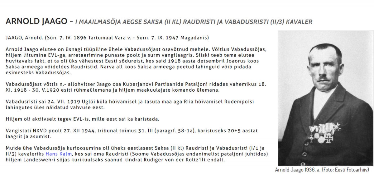 Зря говорят. Если конечно вы не уроженец с. Вара Тартуского уезда. Ну или если не проживаете в Эстонии. https://vapsid.weebly.com/liikmed--toetajad.html Ниже электронный перевод текста (к сожалению Гугл-переводчик) о человеке, который на фото. "АРНОЛЬД ДЖААГО - КАВАЛИСТ НЕМЕЦКОГО (II KL) ЖЕЛЕЗНЫЙ КРЕСТ И КРЕСТ СВОБОДЫ (II / 3) ВО ВРЕМЯ МИРОВОЙ ВОЙНЫ ДЖААГО, Арнольд. (Родился 7 апреля 1896 г. в Тартуском уезде с. Вара - Смерть 7 сентября 1947 г. в Магадане) Образ жизни Арнольда Яаго вполне типичен для человека, участвовавшего в Войне за независимость. Участник Войны за независимость, позже присоединение к EVL, арест красных и смерть в лагере для военнопленных. Однако что делает его жизнь интересной, так это то, что он был одним из немногих эстонских солдат. который выиграл Железный крест в декабре 1918 года в Йоаору с немецкой армией. Сражения немецкой армии под Нарвой можно считать первыми в Освободительной войне. Со времен Освободительной войны так называемый унтер-офицер Яаго участвовал в рядах партизанского батальона Куперджанова с 18 по XI в. 1918 - 30. V.1920 сначала командиром группы, затем командиром разведки. Крест Свободы был получен 24 июля. VII. 1919 г. Во время завоевания деревни Углё и освобождения земель для завоевания Риги за силу, проявленную в битве при Родемпуа. Позже он был активен в EVL, за что его могли наказать. Заключенный НКВД 27 XII 1944 г., суд состоялся 31 III (§ 58-1а), приговорен к 20 + 5 годам лагеря и поселения. Кстати, одним из диковинок Освободительной войны одним из эстонских кавалеристов Немецкого (II степени) Железного Креста и Креста Свободы (I / 1 и II / 3) был Ганс Кальм, получивший свой Железный крест. от себя..." P/C И награды у него не Австро-Венгрии, а Эстонской Республики - https://ru.wikipedia.org/wiki/Крест_Свободы