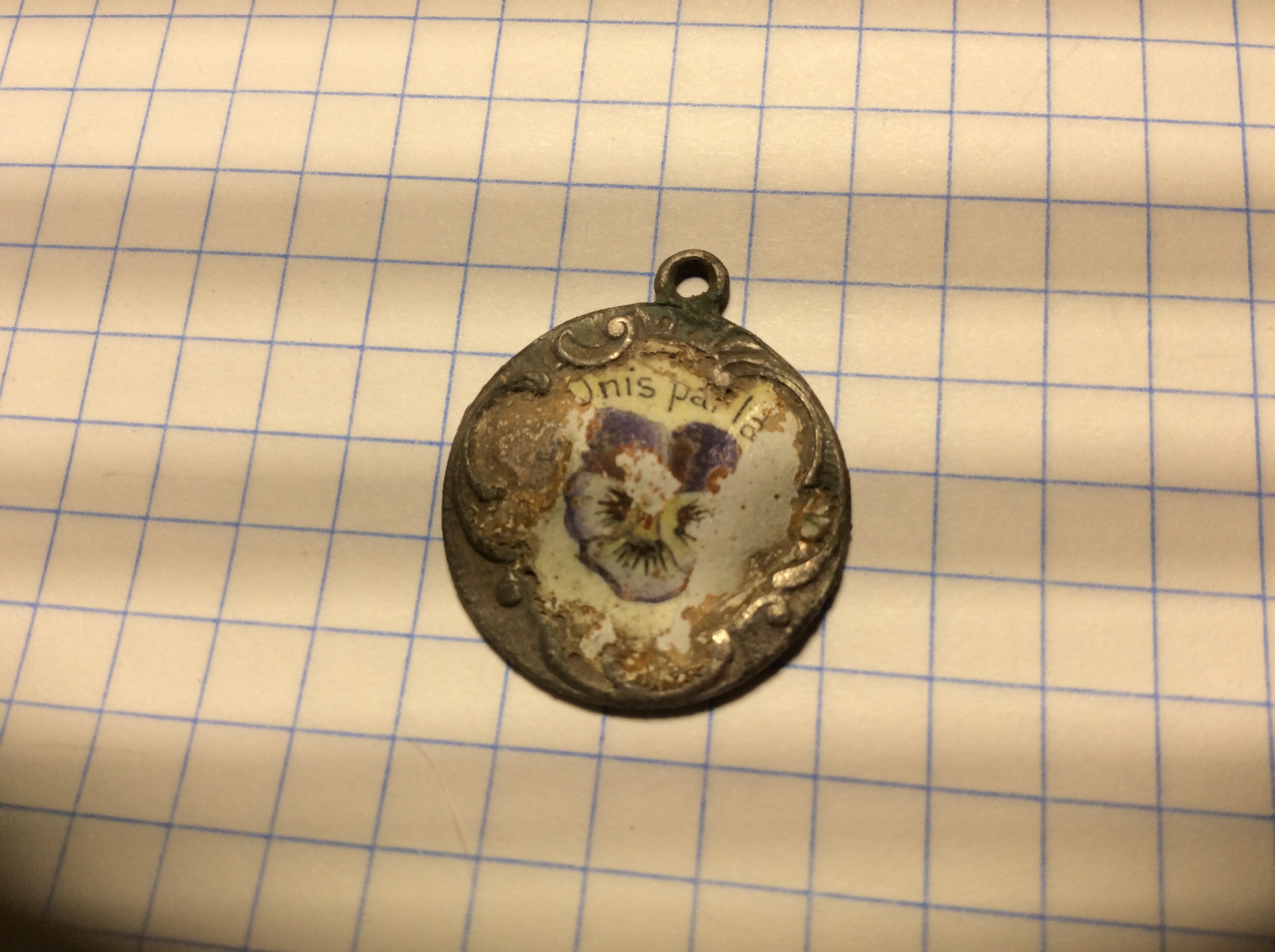 Вітаю . Сьогодні був на пошуках знайшов таку прикрасу срібну. На другій стороні стоїть відбиток 900 напевне проба . Сама квітка нанесена емаль і є надпис . Цікаво яких років і можливо є проходи на віоліті ? Разом покажу ще попалась срібна накладка напевне.