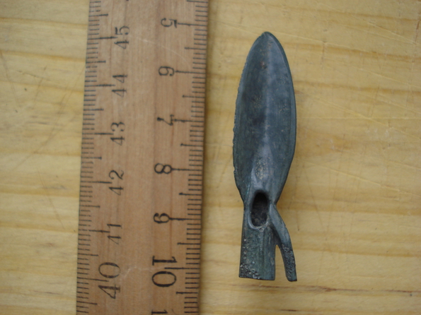Такі знаходили у культурному шарі на скіфському городищі на київщині, в одному періоді і класичні двохлопатеві і трьохлопатеві. У вашого дефект втулки, що міг виникнути під час першого використання, можливо для вторинного використання зробили "тюнінг". Хоча для повторного використання вістря реально знайти у дичині, під час охоти, а не під час бойових дій. Стосовно використання отрути - достеменно це не доведено. Сама бронза, якщо після поранення залишилася в організмі, ще та отрута, вірніше її окисли.