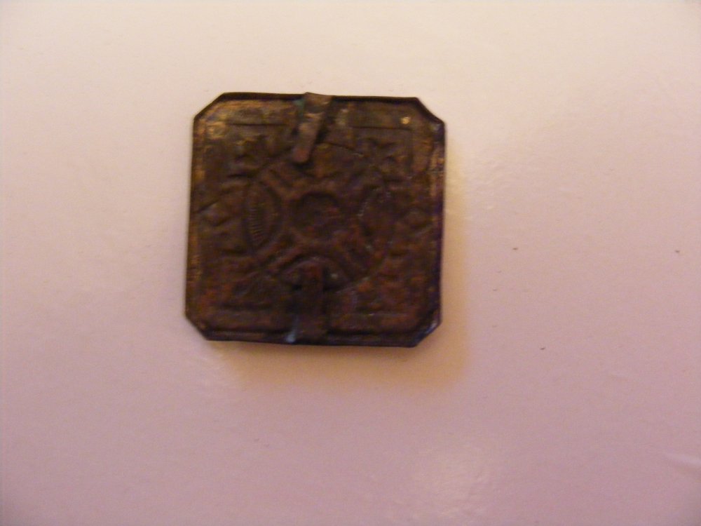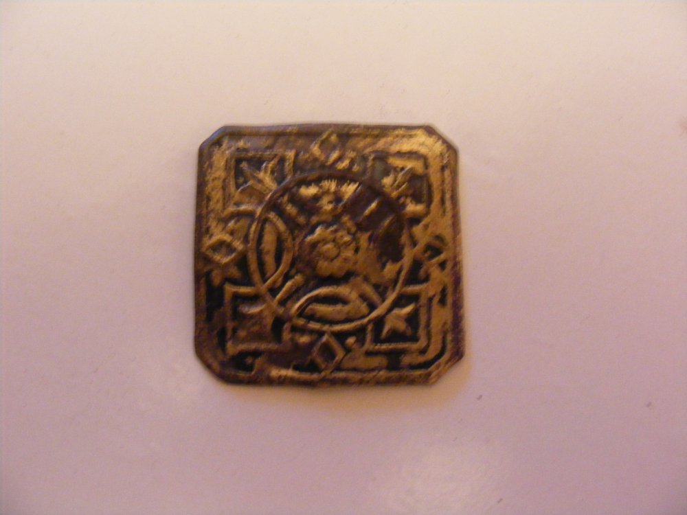 Материал - медь, очень тонкая примерно 0.1 мм. с обратной стороны ушки для крепления. (возможно на ткань) размер 2 на 2 см.
