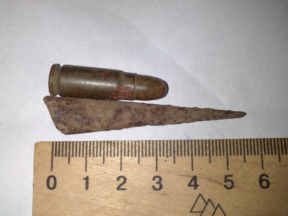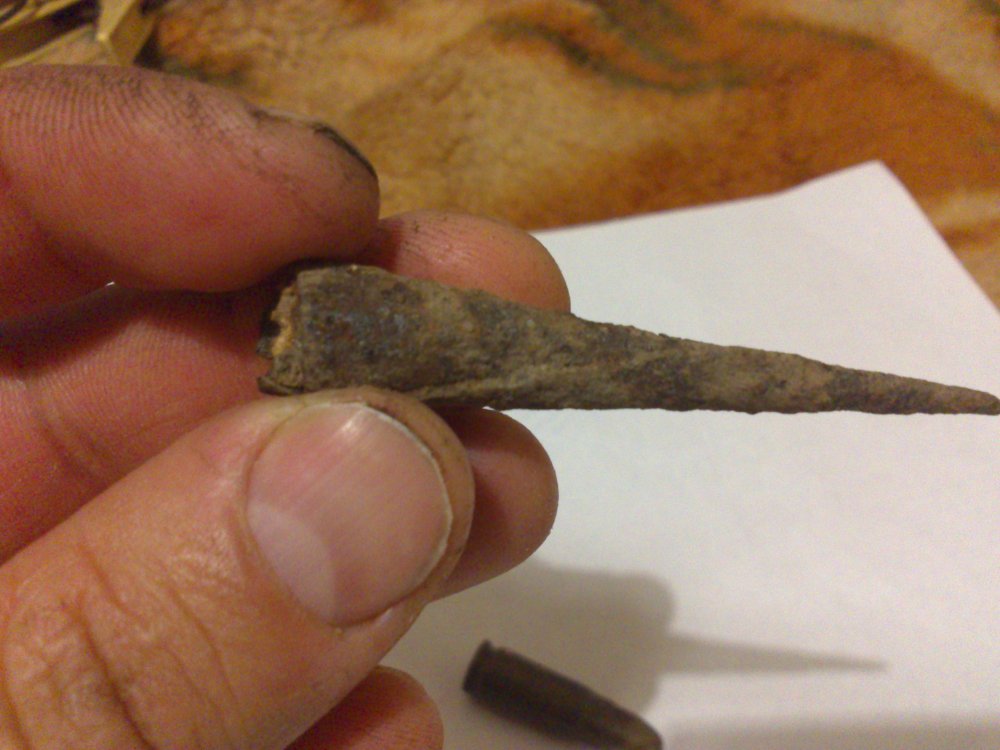 Нашёл в лесу вот такоё.Длина 6,0мм,диаметр у основания 1,1мм,внутри есть остатки дерева.Найдено в лесу на северо-западе Харьковской обл.ранее там были находки по скифам.у скифов таких не было,склоняюсь к татарам.Или детвора игралась?Если присмотреться то можно расмотреть что метал как бы обвит вокруг воображаемого древка.