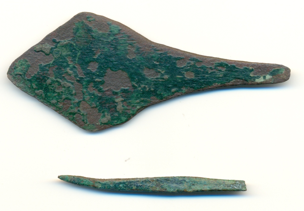 Плагиат-стр.68. Одна сулица имеет перо удлиненно-треугольной формы с округлыми плечи- ками и ромбовидное поперечное сечение. Край черешка загнут почти под пря- мым углом (рис. 2, 13). Другая сулица – с пером листовидной формы с линзовид- ным поперечным сечением (рис. 2, 14)
