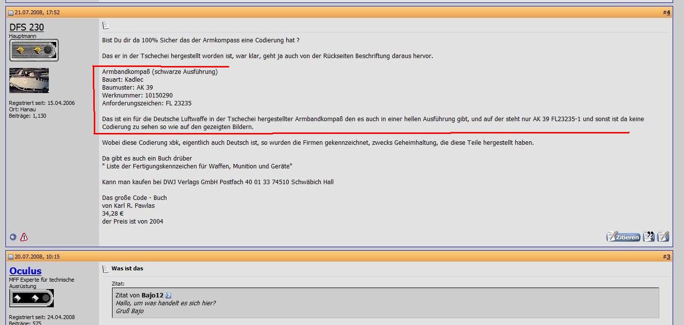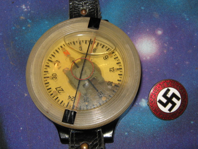 Массивный наручный компас "Armbandkompass mod.1939" ("АК-39"), , входивший в стандартный набор снаряжения летчиков Люфтваффе. Корпус из черной пластмассы, с плавающей шкалой, на которую нанесены крупные светящиеся деления. Надевался прямо поверх летного костюма на руку при помощи кожаного ремешка, прикрепленного к металлическим ушкам компаса двумя латунными заклепками. Компас и ремень - в люксовом состоянии. Сзади легко нацарапаны инициалы владельца, М.В. Цена - 170 евро. (значок-для масштаба...к лоту не прилагается) Здесь аналог: http://209.85.129.132/search?q=cach...+kompas+"AK+39"&cd=1&hl=ru&ct=clnk&lr=lang_de На крайнем фото-скан обсуждения такой вещи на Милитарии, немецком поисковом форуме.