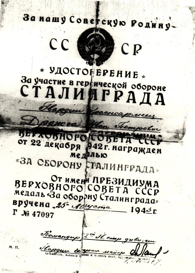 Мой дед Дрожча Иван Петрович прошел всю войну вот его воспоминания написанные им на бумаге после войны Я , Дрожча Иван Петрович 1919 года рождения, работаю в рыбколхозе им. В. И. Ленина на судоремонтной базе, мастер ОТК по ремонту добывающего рыбного флота г. Бердянска. Ветеран ВОВ и труда, инвалид третьей группы, ветеран рыбной промышленности, ветеран 64-7 гвардейской армии и ветеран 72-й гвардейской стрелковой Красноградской, Краснознамённой дивизии. До призова в ряды Красной Армии (ныне) Советской Армии работал на судах рыбного флота в должности «юнги» при Бердянском рыбзаводе, затем предприятие послало меня учиться в Геническую мореходную школу на 3 года. Успешно закончив и получив морское звание судового механика 3-го разряда. После окончания мореходной школы прибыл на Бердянский рыбзавод, меня послали работать на рыболовецкие суда помощником механика а затем и механиком рыболовного судна «Харьков», до призыва в армию. В Октябре месяце 1938 года был призван в ряды Красной Армии Бердянским горрайвоенкоматом в 380-й гаубечный артиллерийский полк Одесского военного округа г. Александрия. Закончил полковую школу, шестимесячную, и получил воинское звание младшего сержанта. Эта часть усиленно готовилась на Финскую операцию и я в том числе в зводе разведки. Погрузились на поезд и направились в сторону Финляндии. Разгрузились на одной из станций в близи Ленинграда и двинули своим ходом на Финский фронт. Не успели развернуть полк, как была дана команда свернуть артиллерийский полк и направили в сторону Польской границы и там развернули полк по боевому. В 1939 году наш полк в том числе и я участвовали в освобождении западной Украины и Белоруссии а так же восточную часть Польши. После освобождения вышеуказанных территорий, артполк состоящих из трёх дивизионов из которых два дивизиона были на лошадиной тяге и один дивизион на мехтяге направляют к Румынской границе. В 1940-м году в составе артполка, взвод разведки и управления участвовал в освобождении Бессарабии, ныне Молдавская СССР. Затем продолжили военную службу в г. Бельцы, Молдавская СССР. Весной 1941-го года меня перевели из артполка в штаб ВВС 21-й смешанной авиадивизии на аэродром близ г. Одесса в экипаж радиостанции 11-АК на двух автомашинах ГАЗ-АА. Электромеханик, техническое обслуживание радио аппаратуры и снабжение радиостанции электрическим током. Немного времени пришлось на ознакомление с новой частью и новым назначением, немногим более одного месяца, как грянула Великая Отечественная война. Первые налёты вражеской авиации на город Одесса и сильнейшие бомбовые удары по нашему аэродрому вблизи города, с первых минут ВОВ были убитые и раненные товарищи нашей части, большое количество было выведено из строя боевых самолётов и машин технического обслуживания самолётов. Ожесточённые налёты вражеской авиации продолжались около полутора месяца, не было живого места в расположении аэродрома, техника обслуживающая самолёты в том числе и радиостанция 11-АК была зарыта в землю, оставшиеся самолёты тоже. 5-го августа 1941 года г. Одесса был окружён немецкими и румынскими армиями, началась оборона города, которая продолжалась 73 дня. В скоре линия фронта переместилась на наш аэродром. Радиостанцию отогнали ночью в городские кварталы и закопали в землю для её спасения что бы иметь связь с б