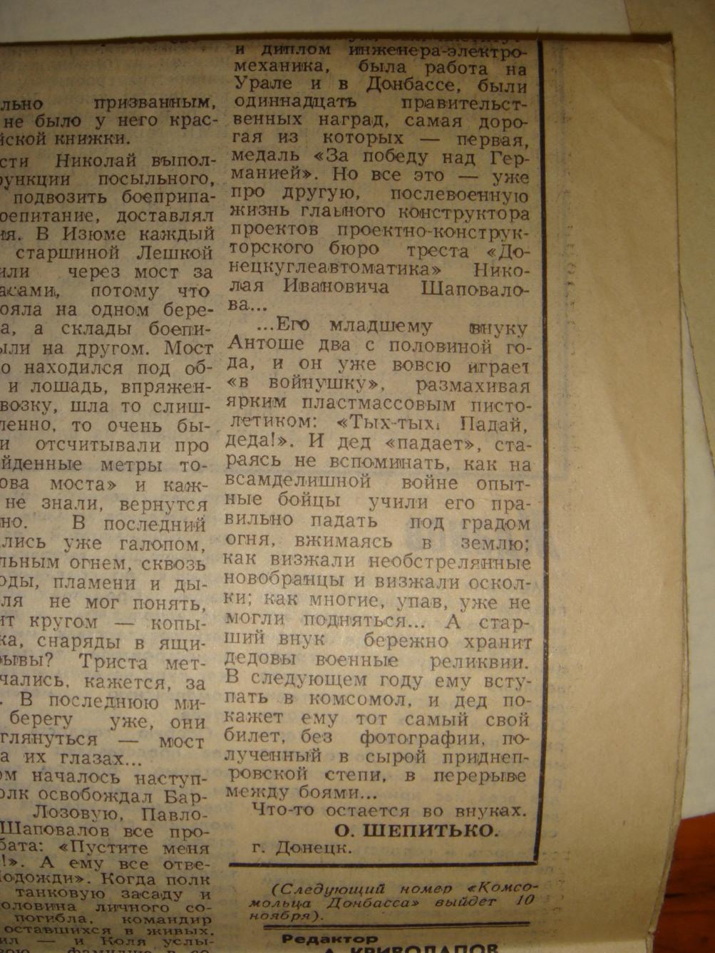 Никогда не забуду однополчан, с которыми пришлось пройти от Сталинграда до златой Праги. Боевые товарищи радисты; Шатилин П., Корягин М., Перепёлкин В.И., шофёр радиостанции РСБ Кудашов П., Соломаха Г., Шпак А., Подставкин И., Каприелов В., командир радиовзвода фамилию которого забыл из г. Горького. Помощник по технической части 101-го батальона связи Чумаченко Е. Д.; связного Мерликова А; Сабельникова А.. Командиров батальона связи товарища Гуськова М. П.; товарища Полунчукова Ю. В.; Марчевского Н. Б.; с которыми пришлось многое пережить, выручать друг друга в ожесточённых боях. А мне лично пришлось пройти в боях от границы до Сталинграда и обратно от Сталинграда до златой Праги, а в 1939 году захватить Финскую, Польскую кампании и освобождение Бесарабии в 1940 году. Иногда казалось, такое безнадёжное положение в бою было, что уже конец жизни. Это всё было в моей молодости. Были такие моменты, хотелось скрыться в глухой тайге, ничего и никого не слышать, не видеть, успокоить свои до предела испорченные нервы. Вспоминаю о далёком прошлом, тяжёлом и страшном для нашей Родины и её Советской Армии, меня с честью выполнившего свой солдатский долг, выбравшегося живым из той войны. Из моей большой земли ушли на фронт защищать Родину шесть братьев и одна сестра. Не вернулись с поля боя брат и сестра, ещё один брат инвалид ВОВ второй группы. А ведь сегодняшний мир на нашей земле отвоёван нами в 1941-1945 годах, муками, страданиями, потом и кровью, многими и многими жертвами. Демобилизован в октябре месяце 1945 года, вернулся в родной город, узнать которого нельзя – 85-90% разрушен. Жилья нет. Так встретила меня родная земля. Мама не дождалась нас, умерла, остался чудом в живых отец, которого по счастливой случайности не задели пули автоматных очередей уходящих немцев. Пришлось заново строить себе жильё и одновременно восстанавливать до тла разрушенный город в котором все голодали. На работу вновь устроился на Бердянский рыбзавод, с которого был призван в ряды Красной Армии. Работать пришлось на очень плохом в то время рыбном флоте. Переганяли рыболовные суда из Румынии и Кенингсберга, вокруг Европы, для пополнения нашего рыбного флота. В 50-х годах закончил Ростовское мореходное училище, получил звание техника-механика судовых силовых установок (универсал) 2-го разряда.