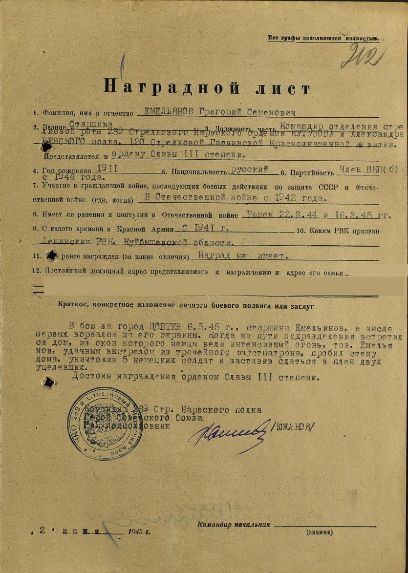 Вот Мой Прадед. награжден: Орден Красной Звезды № 171896 Орден Славы 3 ст. № 476874 Отечественной Войны 1 ст. Юб. № 2285462 Я Горжусь что у Нас Были такие Славные Отцы Деды Прадеды . Вечная Память ИМ.