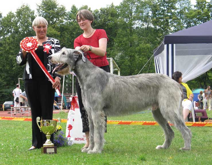 самый крупный собакин-ирландский волкодав,примерно до 120см.Но страшненький,худой,несчастный,бородатый,шерсть сосульками.И добрый.