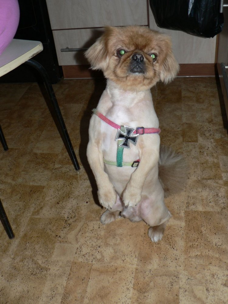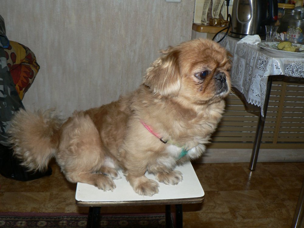 Зять, гуляющий с псом, в командировке, поэтому этот 5- летний "хвашист" Бакс тусуется и у нас. Три в одном - пекинес, кокер-спаниель и по длине, как-бы такса. Жрать любит!!! Поэтому на жопе и сидит. Сегодня обрили в очередной раз. Живёт с внучкой, что б шерсти меньше было.
