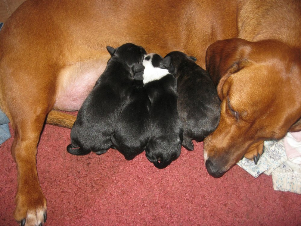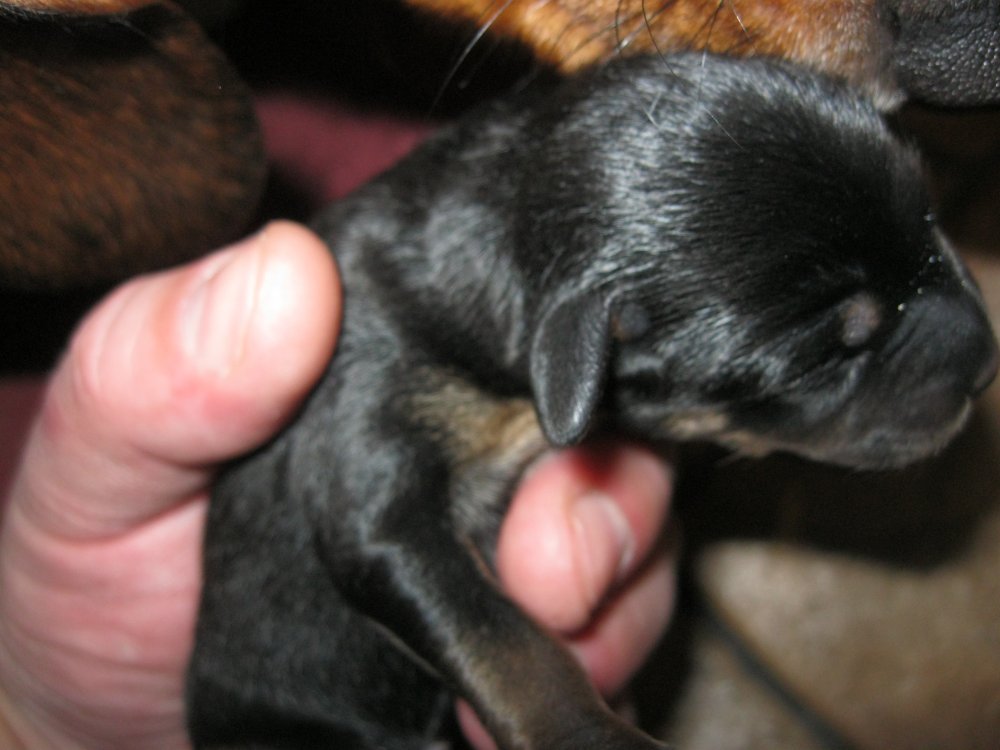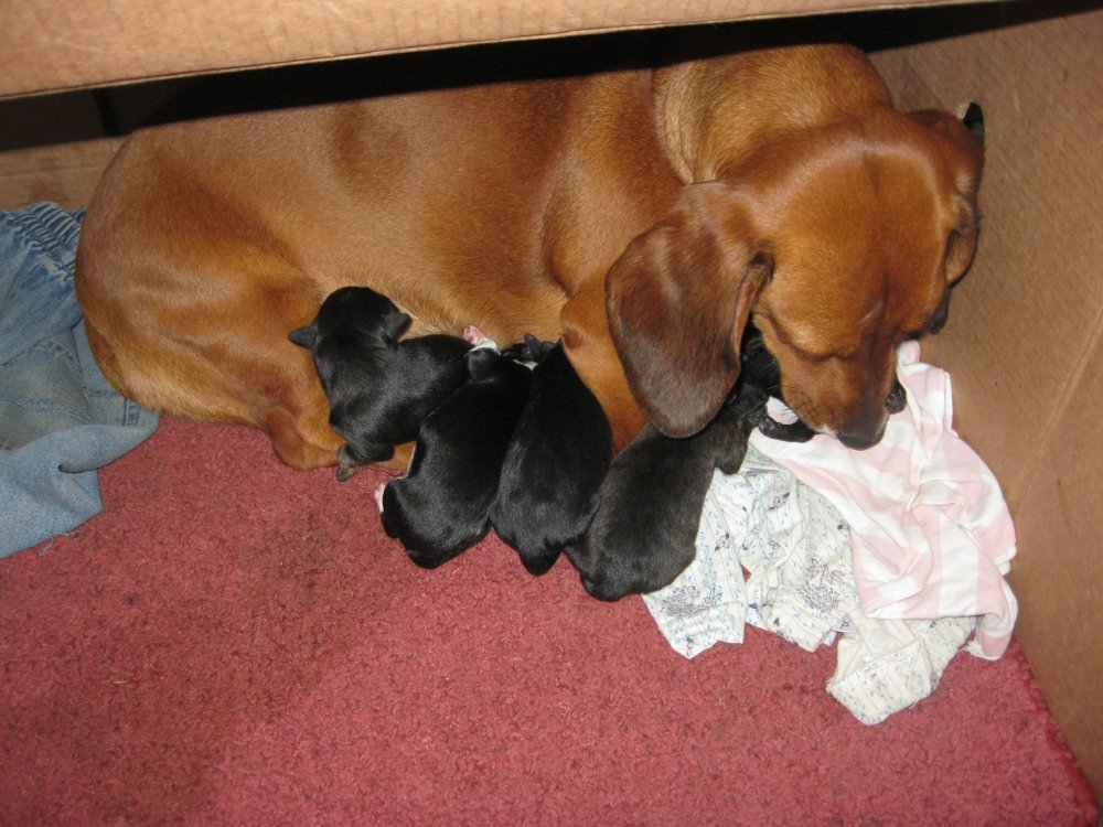 Такса таки разродилась на +5. Все черные (с коричневыми подпалинами на щеках/подбородке и один черно-белый) Половую принадлежность не смотрел еще. Смешные ...