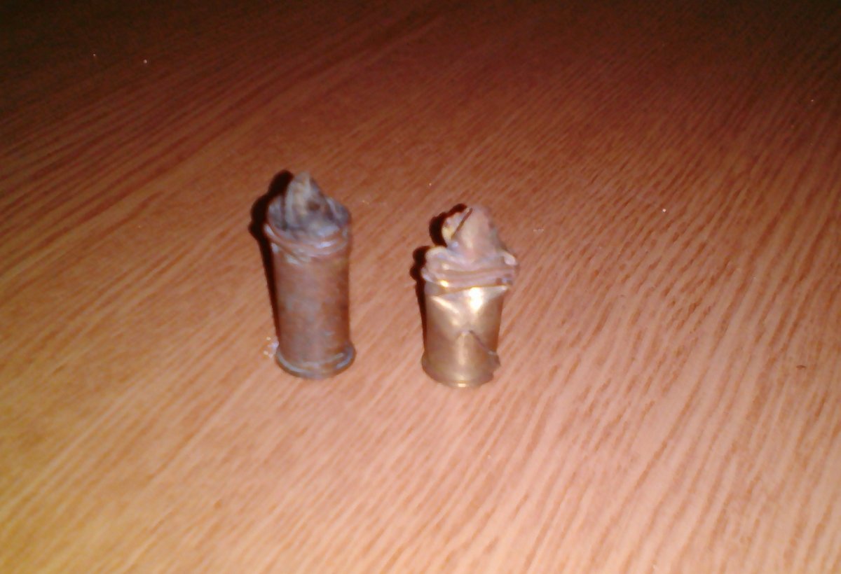 Ну, с капсюлями более-менее разобрались. А вот что делать с таким дефектом, как собирание гильзы в "гармошку"? Почему это происходит?. Года два назад попалась мне гильза мосина (надо сказать древняя, 1905 г. С.Петербургский патр. завод, маркировка П/05/КР/II), которая была странным образом "сложена" в гармошку, причем явно это случилось ешё во времена её "молодости" - т.к. ни один фрагмент гильзы не отвалился, металл "сложился в гармонь" очень элластично, как стекающий с ложки мёд. Что интересно - в месах образования гармошечных изгибов нет НИ ЕДИНОЙ ТРЕЩИНКИ! Я тогда подумал, что кто-то из бойцов просто поиздевался над гильзой со скуки. Осталось только пожалеть, что испортили такой древний коллекционный экземпляр, да и забыть. И вот недавно, попадается мне снова мосинская гильза с таким же "гармошечным" дефектом, почти один в один! Ну, эта была уже из более молодых мосинок, Т 27. Уже как-то не тянет на совпадение, какая-то система в этой "гармошке" прорисовывается. Мог быть такой дефект при контакте гильзы с оружием? Вот они на фото - та, что слева, тульская, 1927г, правее - Питерская, 1905г