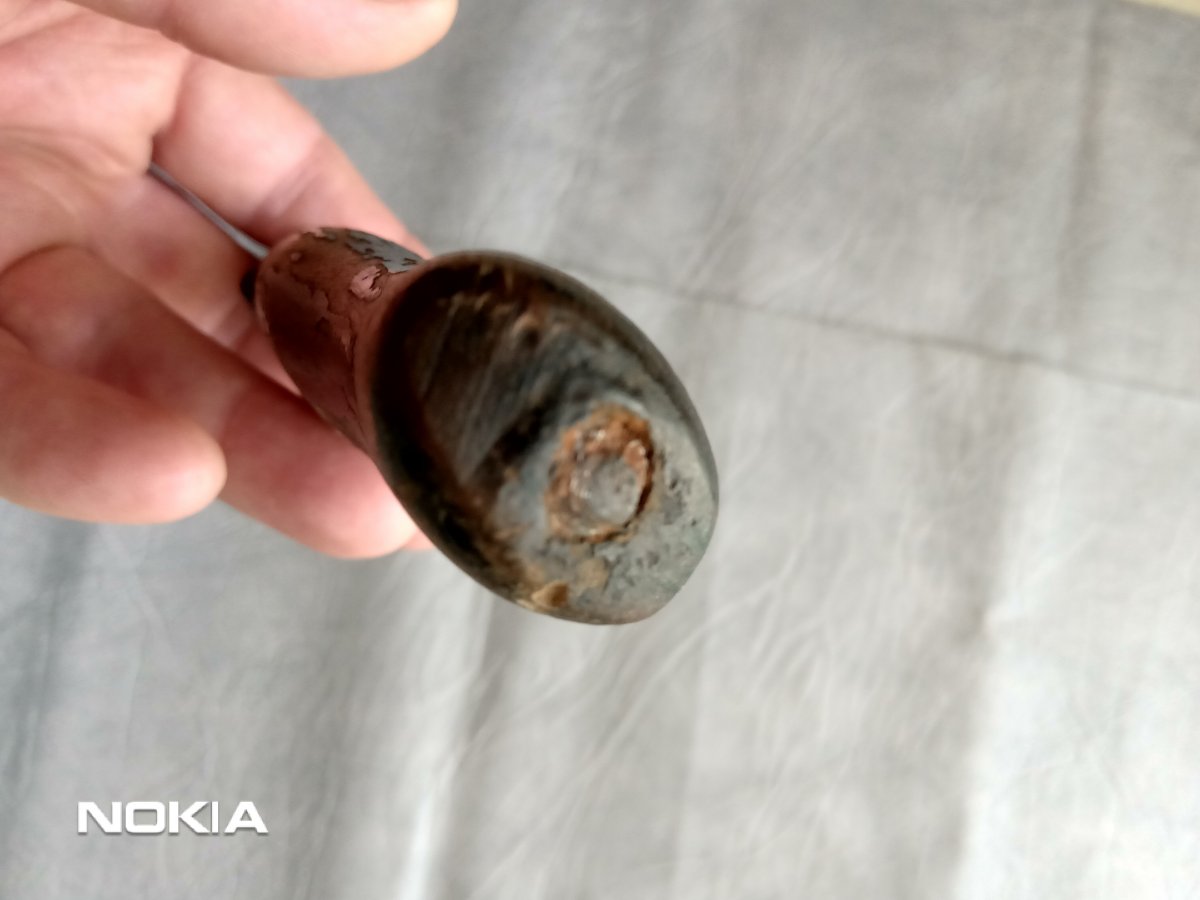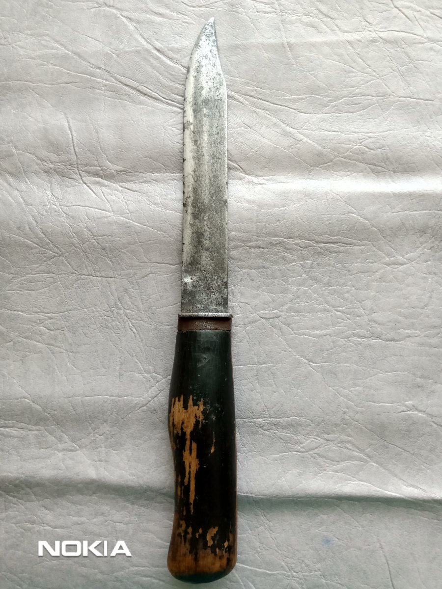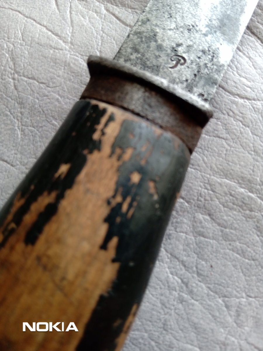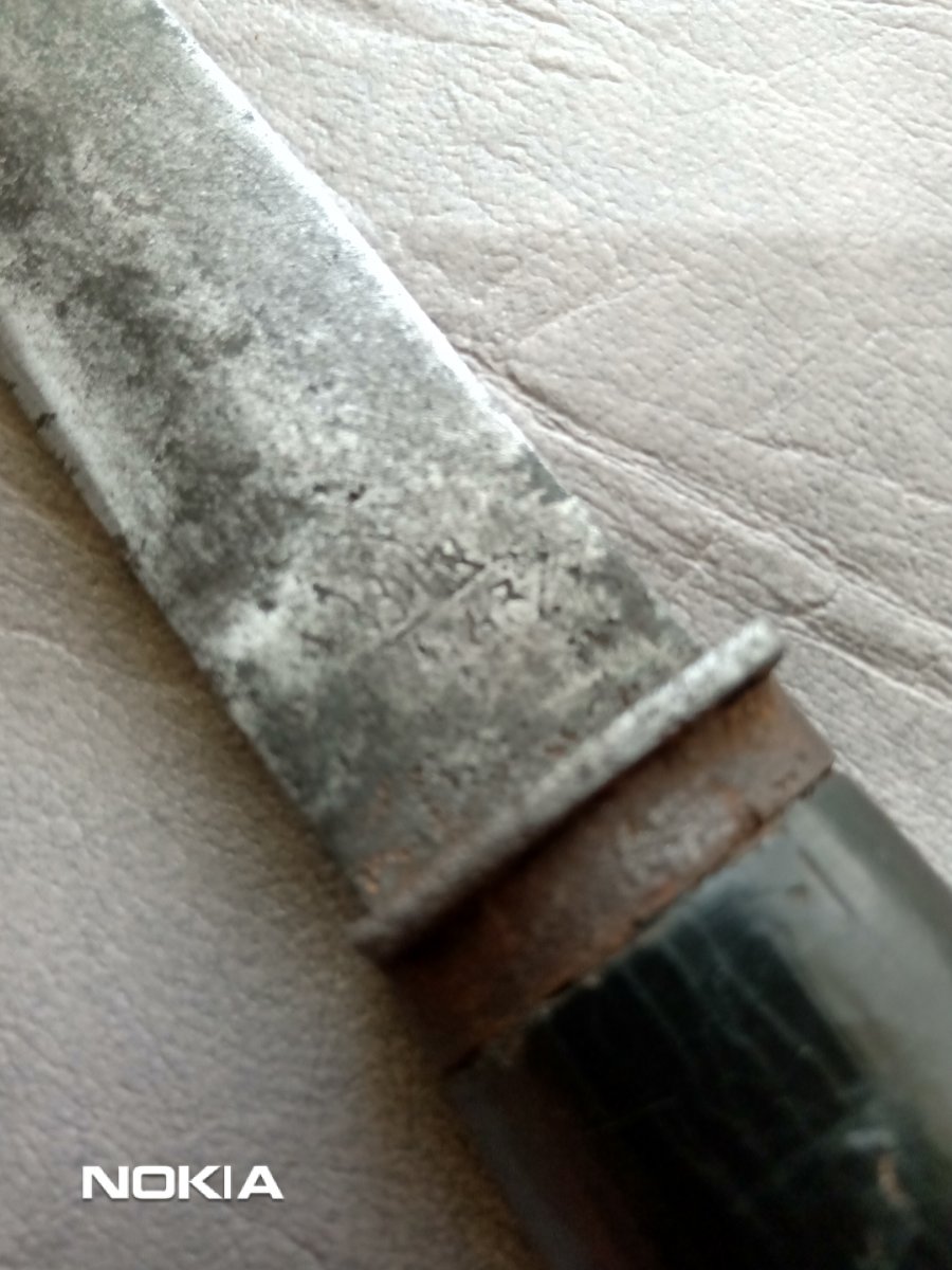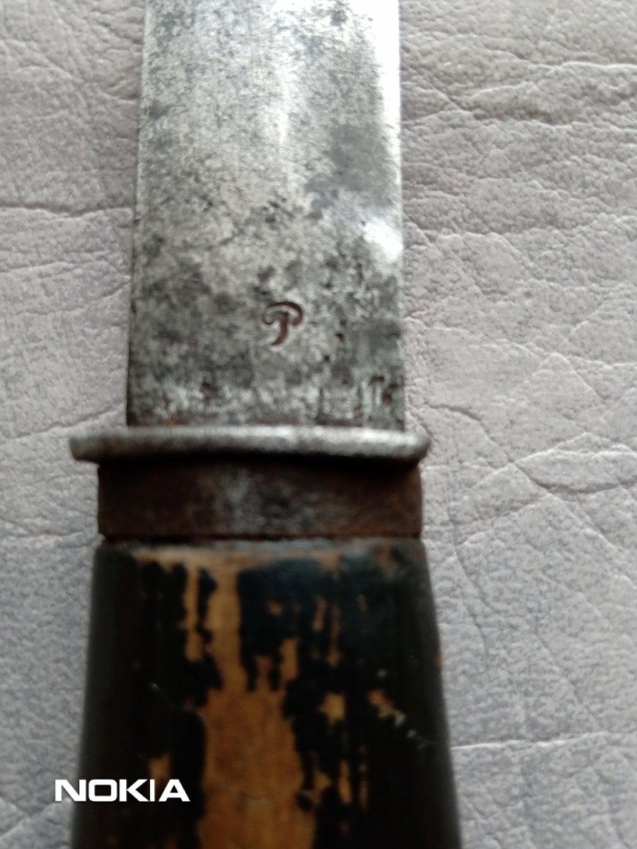 Доброго дня))) Предоставляю на общее обозрение находку времён ВМВ. Это нож НР-40. Судя по клейму,был изготовлен в 1943 году. Был найден при разборке старого сарая в городе Кривой Рог,лежал в простенке между окном и стеной. Сразу был помыт холодной водой,а клинок,остатки гарды и больстер протерты лимонной кислотой. Никакого механического насилия не совершалось. Размеры: общая длина 263 мм клинок до гарды 150 мм рукоятка с гардой 113 мм ширина возле гарды 22мм, ближе к острию 21,5мм толщина по обуху 2,6-2,7 мм Рукоятка деревянная,была покрашена в черный цвет,краска облезла,но есть остатки. Гарда,вероятно,была срезана,достаточно ровно и симметрично. На гарде и больстер присутствует ржавчина и мелкие раковинки. На торце рукоятки место расклепа. Там ржавчина. Заклепано хорошо, клинок не люфтит вообще. Сам клинок выглядит неплохо,есть очень мелкие раковинки,не сточен сильно и даже сохранил заточку,можно резать продукты. Сохранились клейма с обеих сторон клинка,возле гарды. С одной стороны "ЗиК" и под ним просматриваются "43". Вероятно полная надпись 1943. С другой стороны клинка,тоже возле гарды, расположена буква "Р",прописная. Ножен не было! Просьба к неравнодушным форумчанам,по возможности и желанию, сказать всё,что можно о предмете в информативном плане,а так же оценить материальную стоимость. С ув.