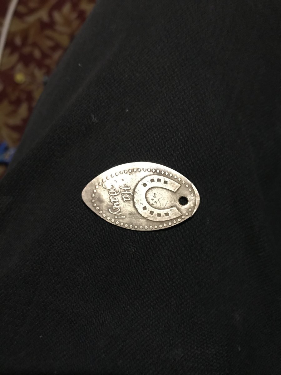 Розкатано на пресі з сучасних 50 або 25 коп.Там де підкова,навіть видніються залишки тризуба.