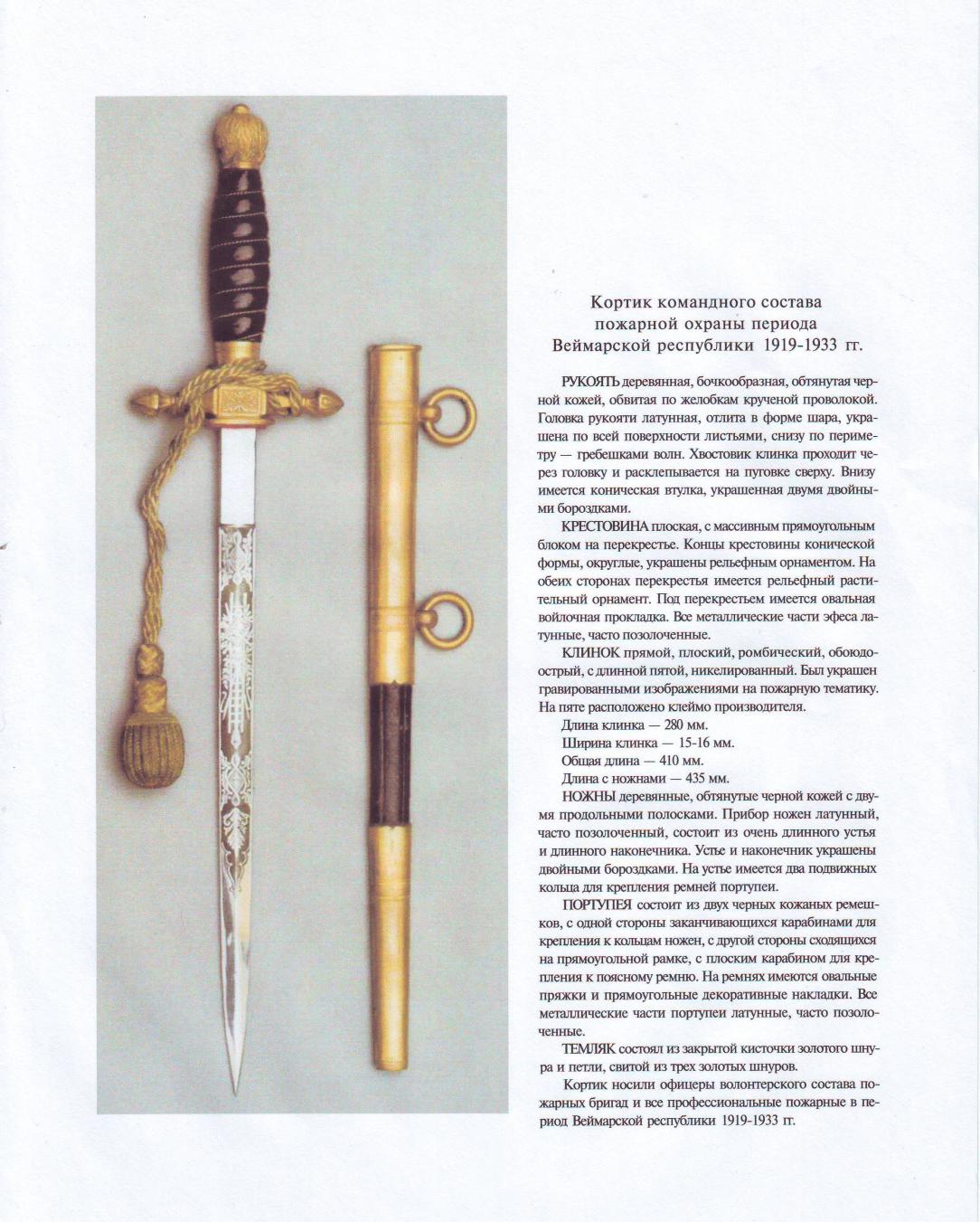 Ваш кортик скорее всего кортик командного состава пожарной охраны прериода Веймарской республики 1919-1933 г.г. Прилагаю сканы : Первые два из книги Круликевича "Кортики", третий скан: из книги Федурина "Кортики мира". Ваш по моему мнению похож на кортик на третьем скане. Но я не специалист по немецким кортикам, может кто из спецов пояснить более детально. С уважением.