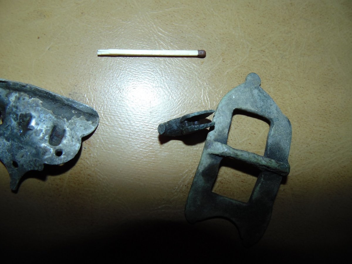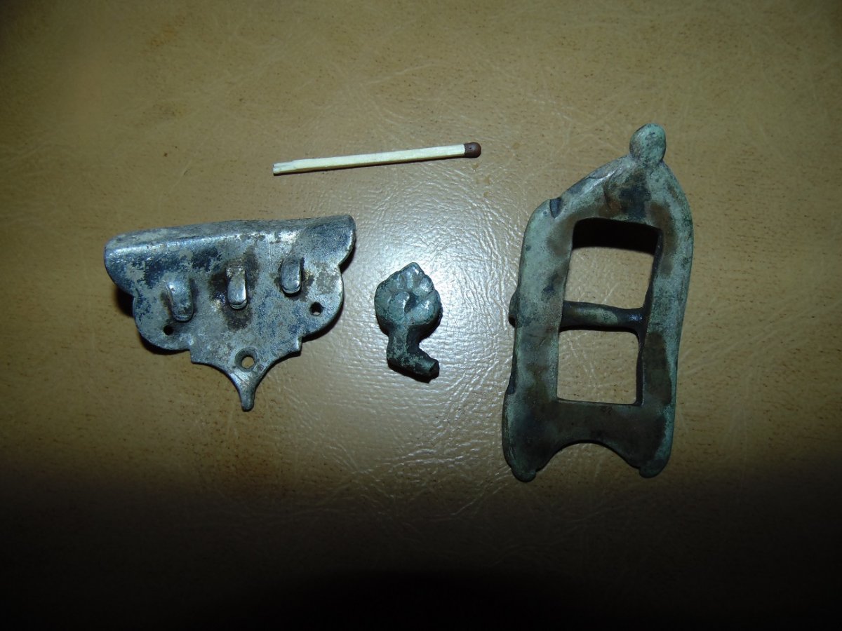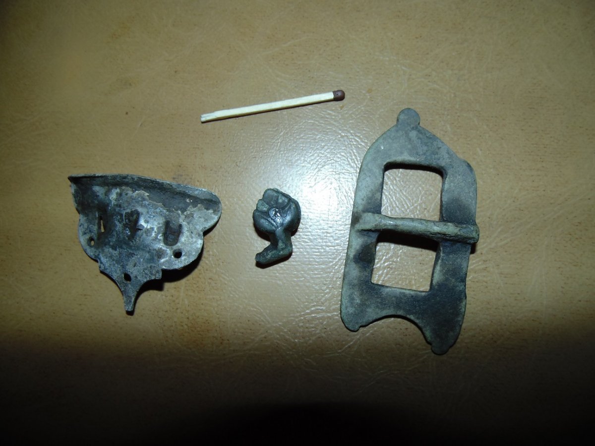 первая штуковина - ременная накладка или накладка на книгу, вторая может быть что угодно, даже запчасть от фибулы.... Патина пряжки зависит от грунта, в котором она находилась, может относится впредь до хуторщины 20 века, может быть кониной. Скорее всего данные предметы соответствуют периоду вашей сопутки.