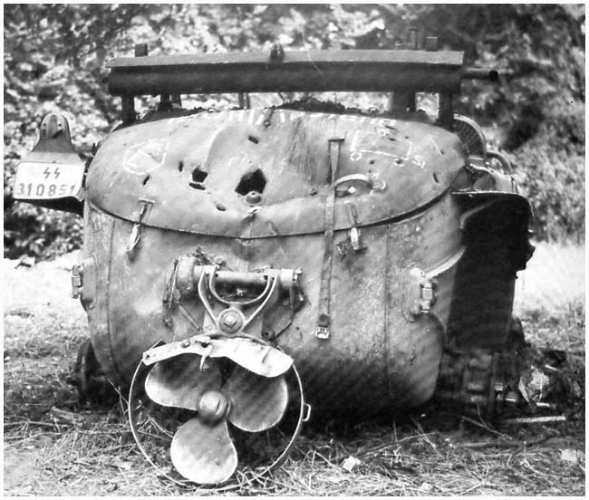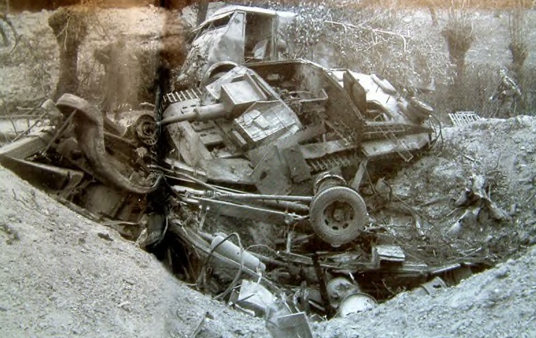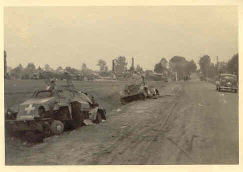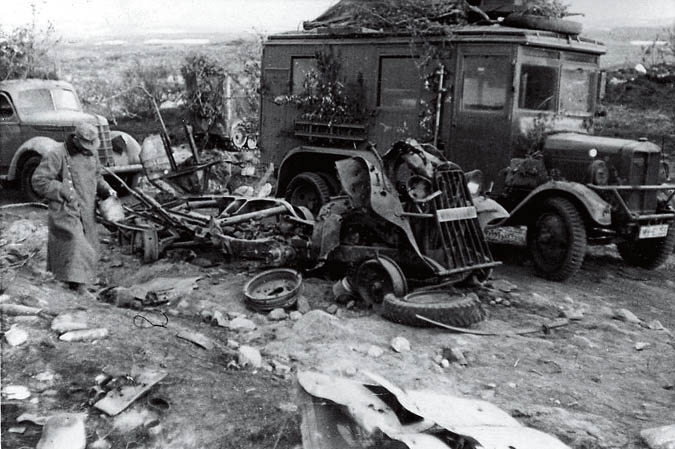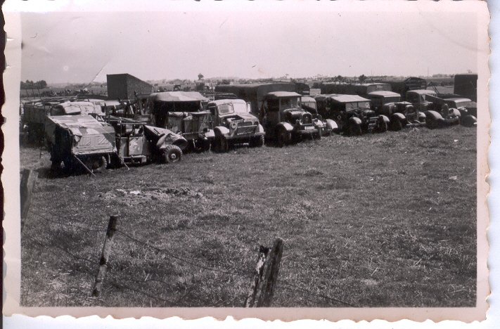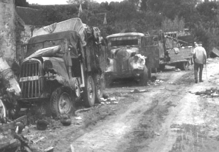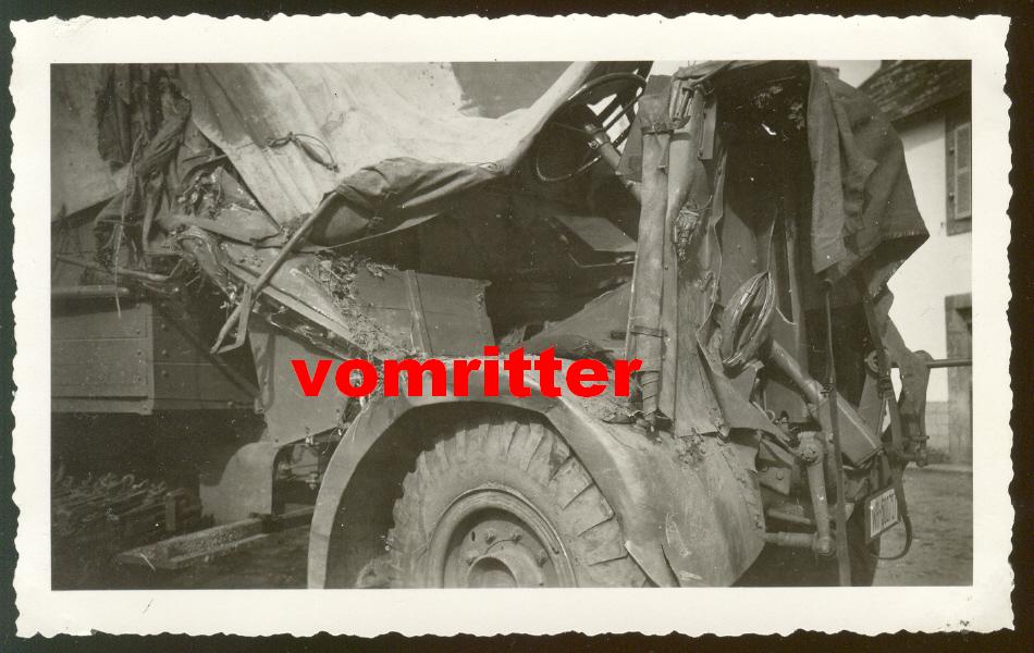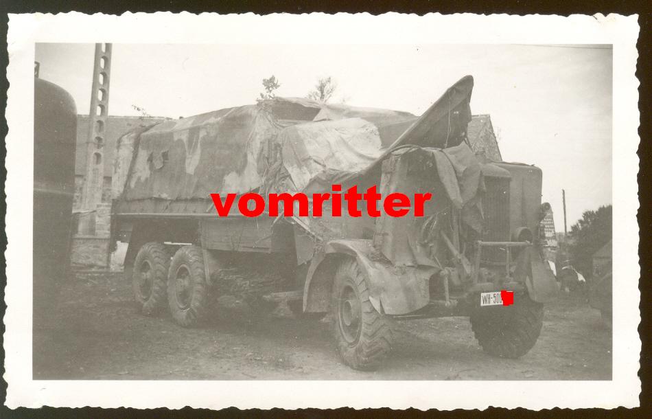 1) Wanderer-W24, уничтожен, но, по видимому, не огнём, воронок не видно, а авто в лепёшку, но всё же. 2) Krupp Protze 3-5) Sd.Kfz.3b-m. Gleisk. LKW2t "Maultier" ("Ford"). 6-10) Sd.Kfz.4-s. Gleisk. LKW41/2t Maultier (Daimler-Benz). Falaise.