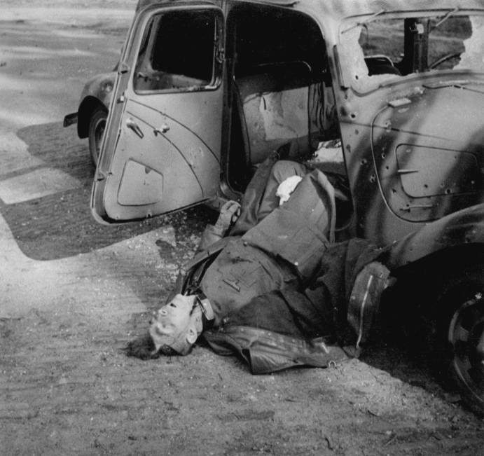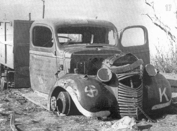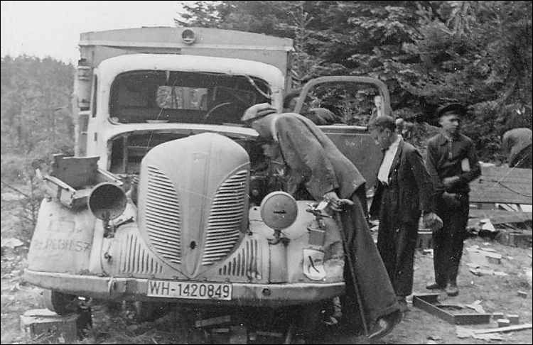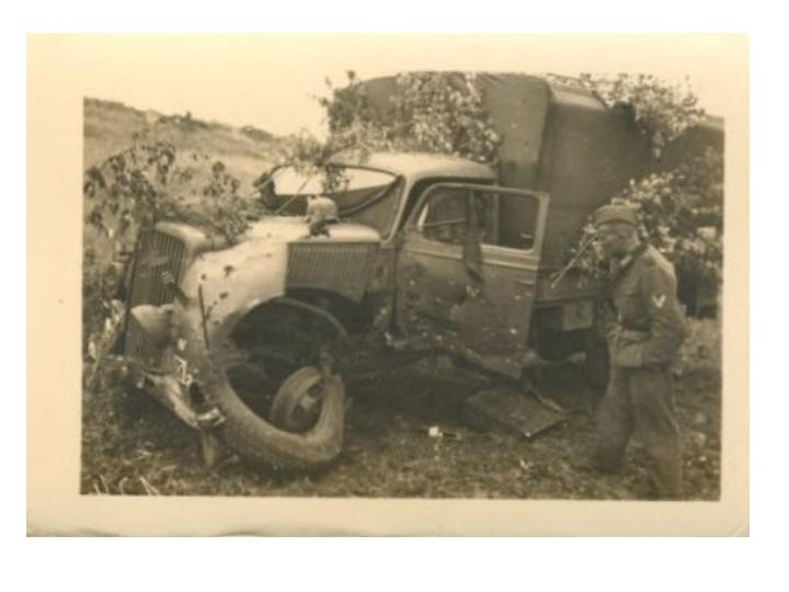Век автомобиля на войне недолог.В отличие от танка или бронемашины автомобиль может быть уничтожен или серьёзно повреждён любым видом оружия.Предлагаю выкладывать в этой теме авто пострадавшие от огня противника. 1. Opel-Olympia ранего выпуска (1935-37г,модель 13237). 2-3.Амфибия VW166,а точнее то,что от неё осталось. 4.Санитарный грузовик Renault AFB2,превращённый в решето стрелковым оружием. 5.Stoewer M12. 6.Солдат вермахта демонстрирует пробоину в leEPkw. 7.Неустановленный санитарный грузовик,получивший снаряд в борт. 8.Chevrolet серии VA/VD 1940 года из 5-й танковой дивизии СС "Викинг". 9.Ford V3000S/SSM "Maultier" после артобстрела или авианалёта. 10.Немецкий солдат позирует в изрешечённом пулями гражданском авто (вероятно французском).