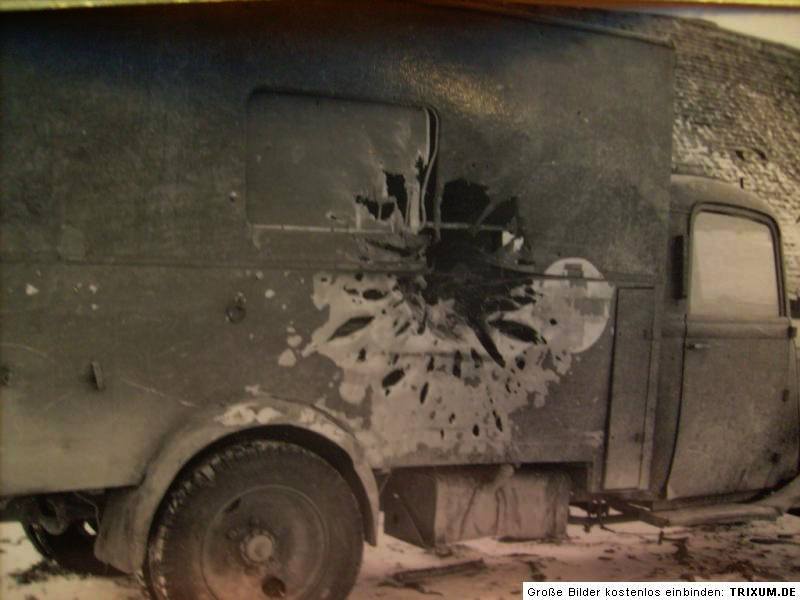 Красный крест на войны не являлся защитой от огня противника.Различные повреждённые и уничтоженные санитарные автомобили: 1-2.Два снимка одного,изрядно продырявленного фургона. 3.Phänomen "Granit" 25 H (Kfz 31) вероятно пробитый снарядом на вылет.Снимок сделан во время польской кампании 11 сентября 1939 года. 4.Неизвестный автобус,точнее его остатки. 5.Ford V3000S с простреленной водительской дверью. 6.Фургон на базе французского грузовика Renault AGC (?). 7-8.Легковой Opel Super 6.На следующем снимке-окровавленная пассажирская дверь. 9.Неустановленный грузовик (вероятно француз) с пулевыми пробоинами двери и лобового стекла.