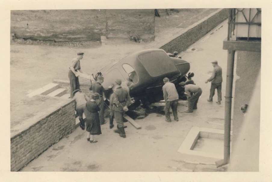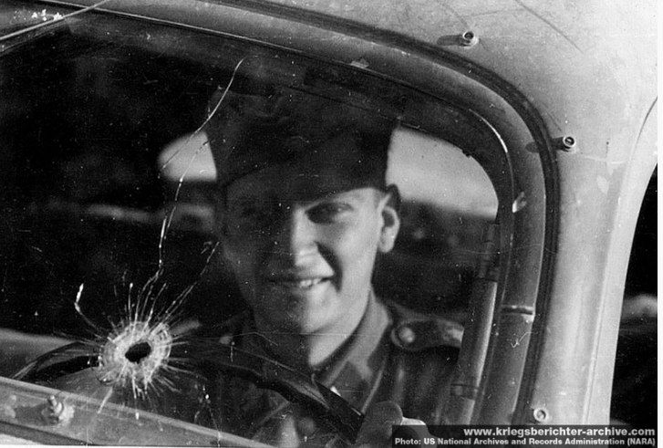 1.Офицер Люфтваффе демонстрирует пулевые отверстия в лобовом стекле тяжелого стандартизованного автомобиля санитарной службы. 2.Пуля, по всей видимости миновала водителя этой легковушки. 3.Экипаж мотоцикла NSU , на коляске которого кружками обведены попадания пуль (?).Снимок сделан в Дании, 1940 год.