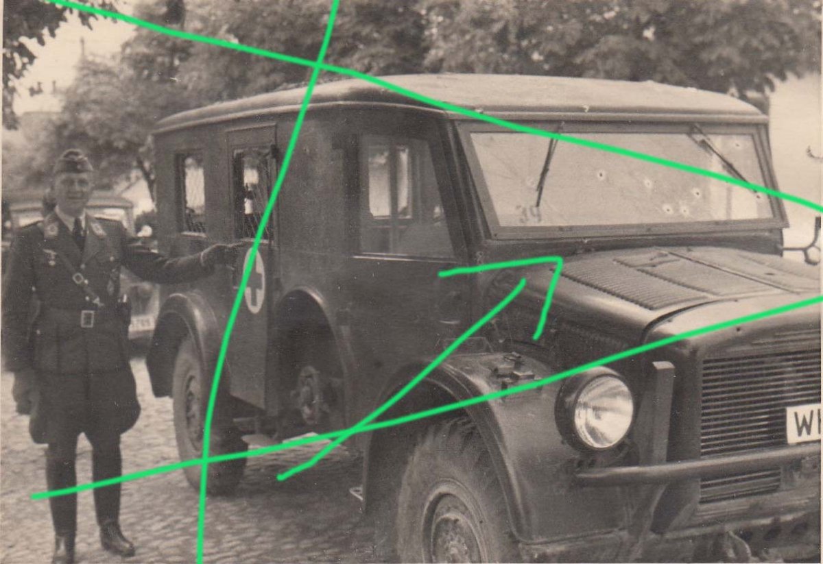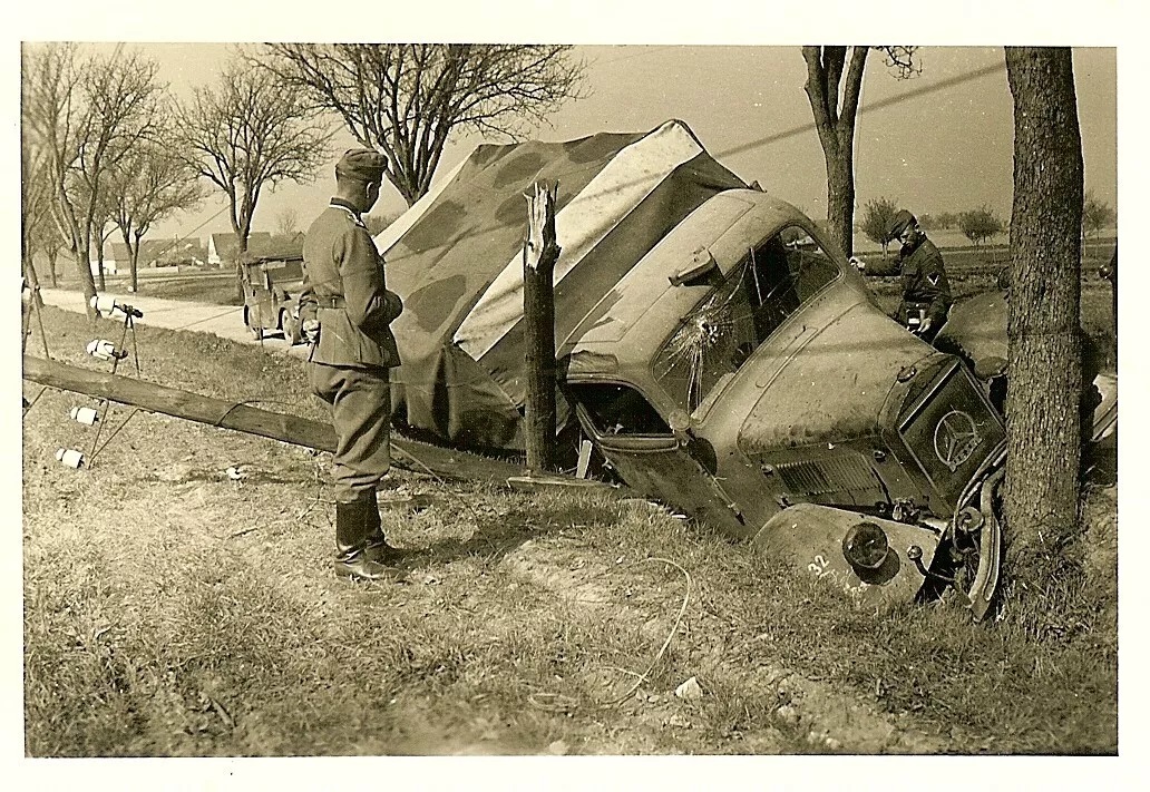 1.Снимок в довольно хорошем качестве.Немецкий Ford модель 1939 года с пулевыми отверстиями в лобовом стекле. 2.Ford BB с простреленным лобовым стеклом.Машина принадлежит к подразделению тылового снабжения. 3.Трофейный британский атомобиль Morris-Commercial пострадавший от огня стрелкового оружия.Кроме лобового стекла пробоины, вероятно, получил также радиатор и передняя крышка блока двигателя.На фото хорошо видно,что эти детали отсутствуют. 4.Klöckner-Deutz (Magirus) S 330 повреждённый на Восточном фронте где-то в районе Ростова.