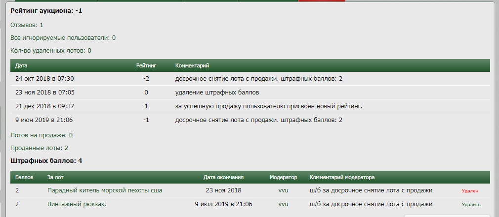 Здравствуйте. При досрочном снятии лота система выдает штраф автоматически. Поэтому в данный момент Ваш рейтинг (-1) и Вы не можете выставлять новые лоты. Штраф обнулится 9 июл 2019 в 21:06. Посмотреть актуальную информацию Вы можете в закладке "Аукцион" в Вашем профиле.