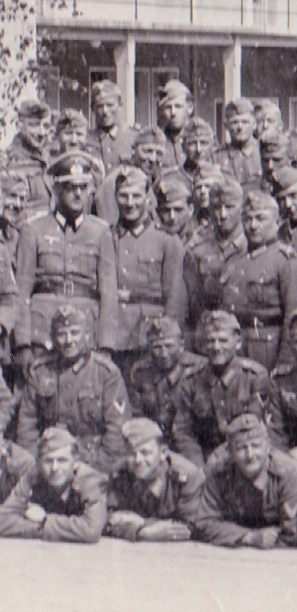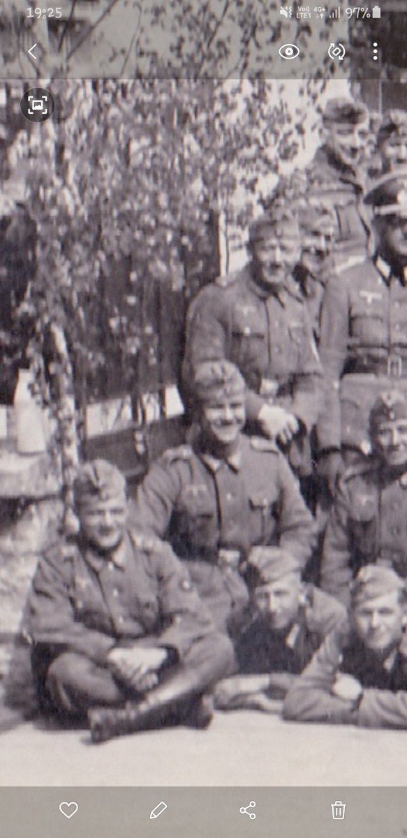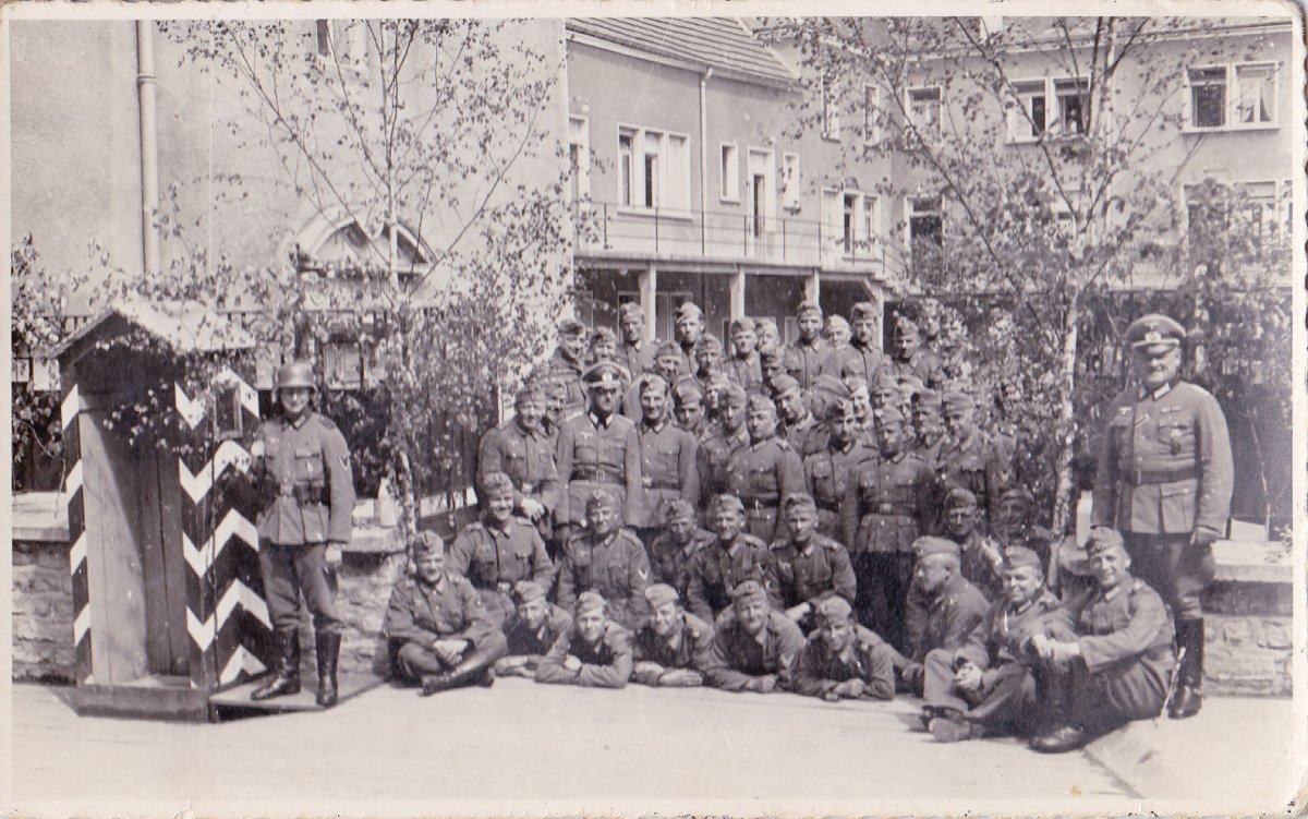 Я так понимаю, что это близь границы... Судя по будке, что должна быть красно - черно - белого цвета... Награды только у одного человека... У второго офицера их нет... У солдат тоже... Форма на них чопорно как-то... Если граница, то где хоть один таможеник... Полный офицер Райха это исключение из правил... И тд... Можно предположить, что это гарнизон охраны...