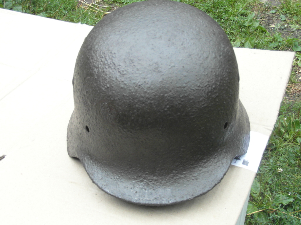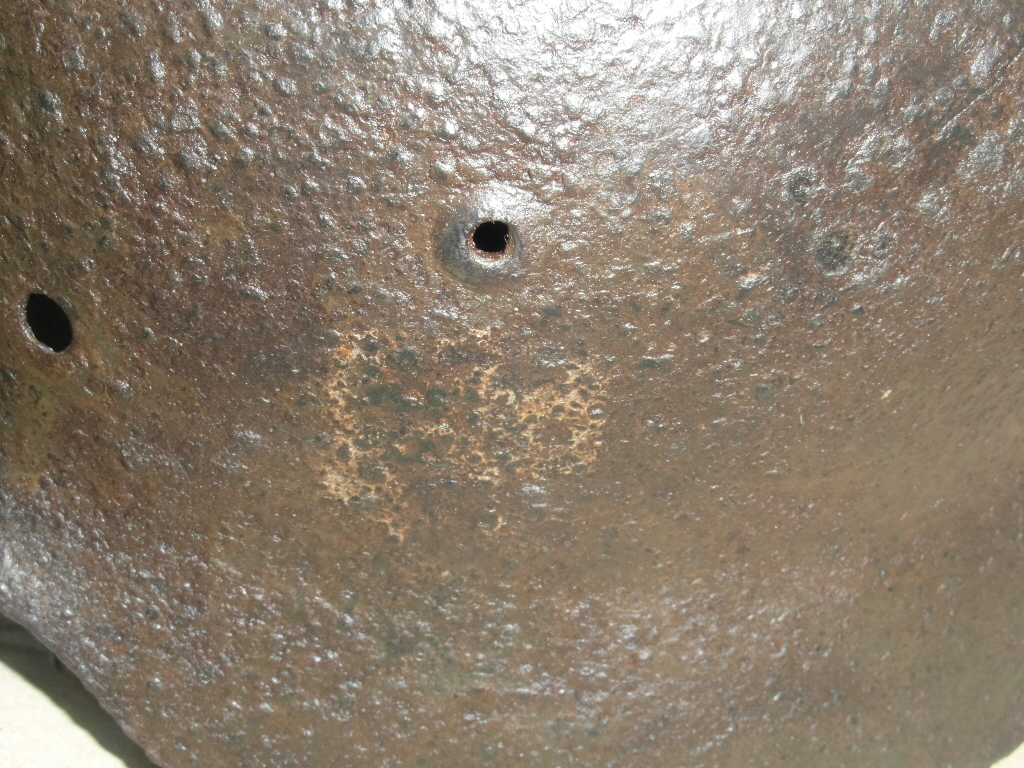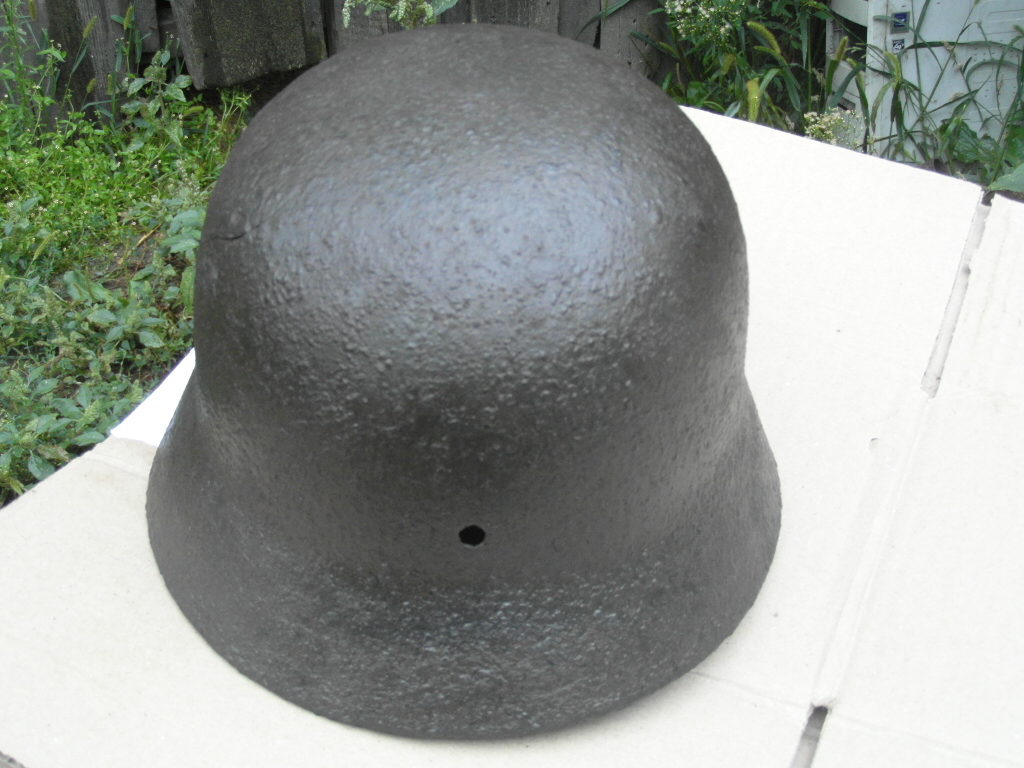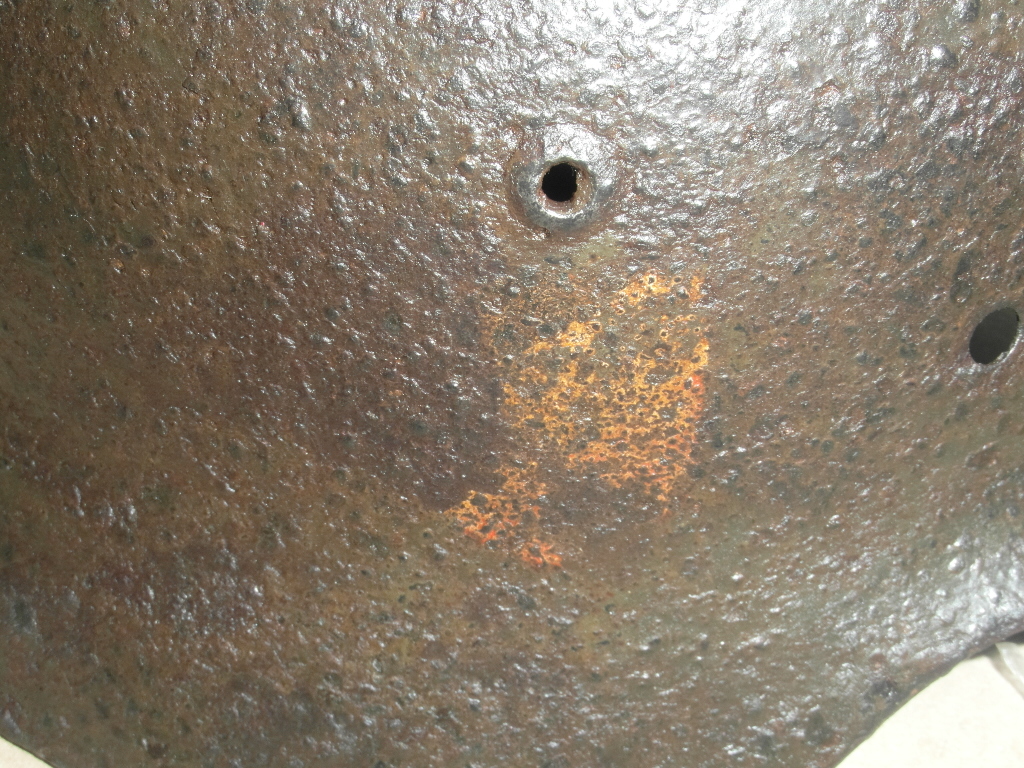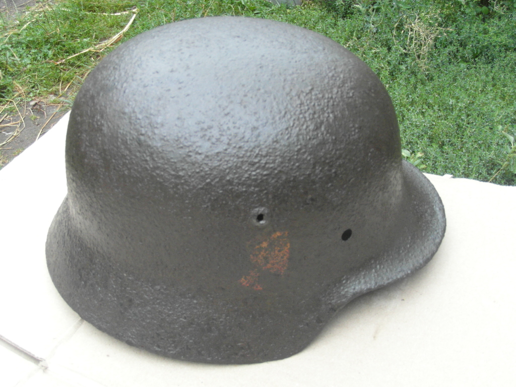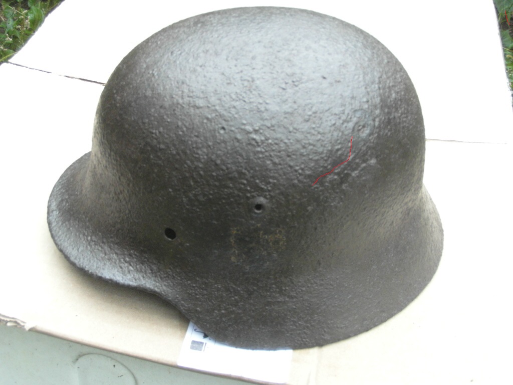 Здраствуйте! Немецкая каска размер 66, досталась по обмену.Правда товарищ который выкопал успел замочить в соляре, я вымыл в мыльном растворе и высушил. C левой стороны на просвет видна трещина - обозначена красным на первом фото. Геометрия не нарушена, имеется равномерный слой ржавчины по всей поверхности. Обозначений не видно- нужна чистка. С левой и правой сторон видны остатки декалей вроде желтого цвета. Интересует примерная стоимость.