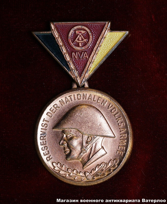 Нагрудный знак резервиста Национальной Народной Армии ГДР «в бронзе», 3 степени, образца 1968 года. Оригинальное название награды на немецком языке; Reservistenabzeichen der Nationalen Volksarmee. Знак был учрежден 5 ноября 1965 года приказа за номером 23/65. Первое награждение состоялось 1 марта 1966 года в честь 10-летия образования NVA (сокращенно, немецкий язык). Знаком резервиста Национальной Народной Армии ГДР в «бронзе», 3 степени, награждался резервный состав ННА (сокращенно) за срок выслуги от 18 месяцев до 2 лет. Кроме версии награды «в бронзе», существовали еще 2 версии награды, в «серебре» (от 2 до 10 лет выслуги) и «в золоте» (более 10 лет службы).