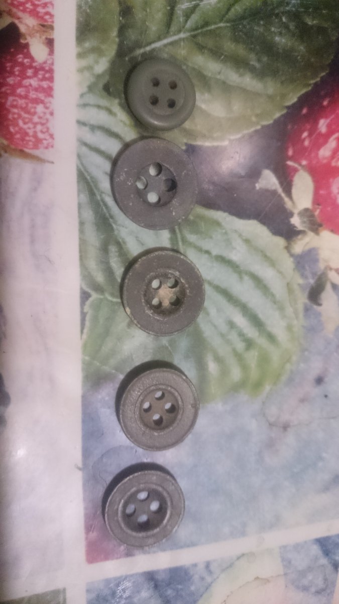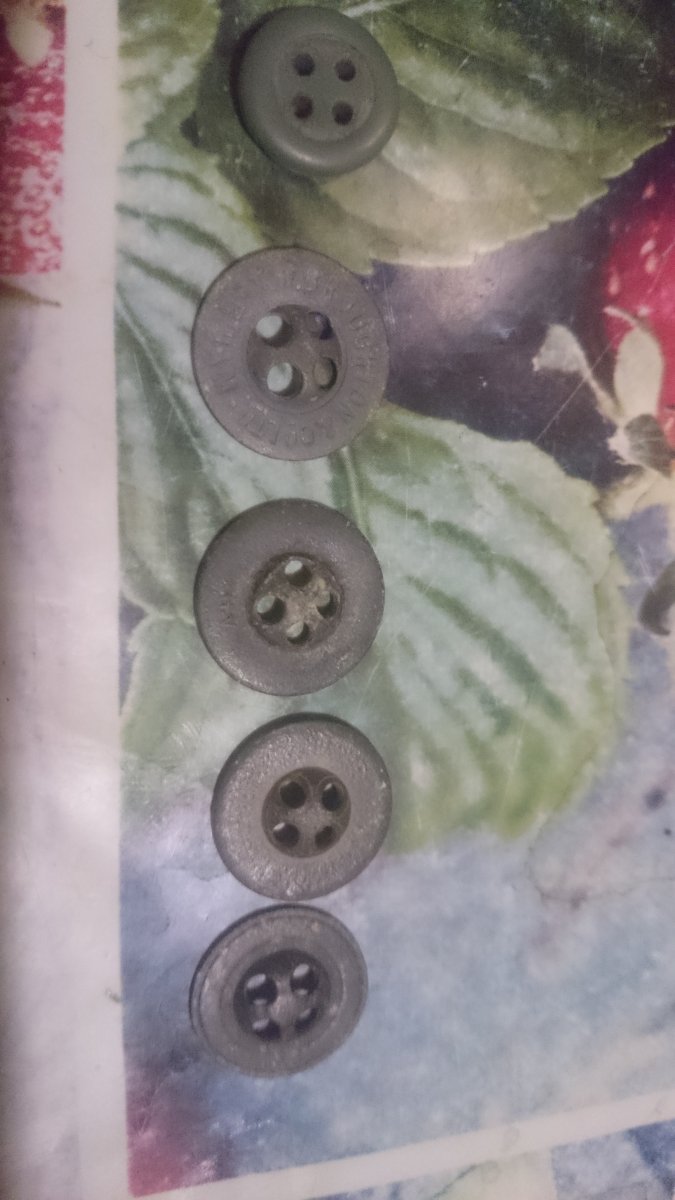 Собственно, вот 5 пуговиц.Пожалуйста,подскажите немецкие ли они. Не менее интересует вопрос, куда конкретно их пришивали. Маленькую зелёную - на одежду,очевидно,но куда точно?Карманы,котельной карман для медпакета...? Сверху нем.на 4 дырки для сравнения.