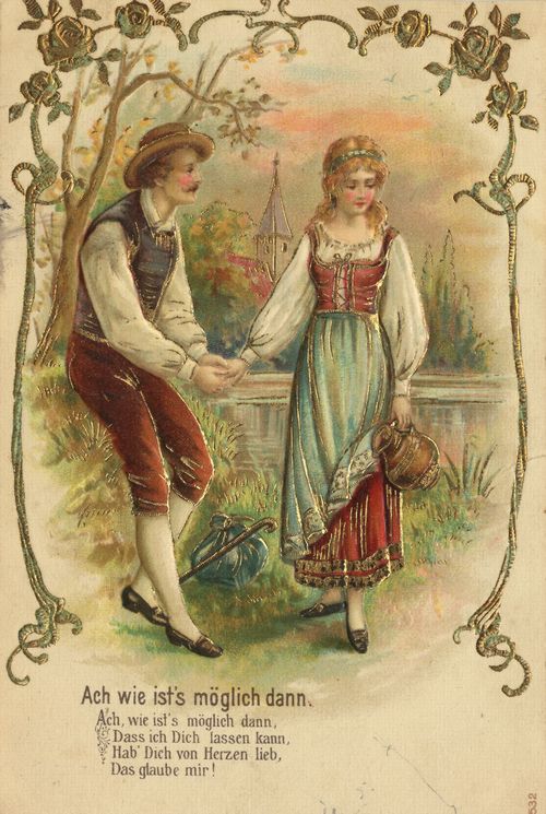 брелок-это на связку ключей, а здесь скорее всего медальон, на шею. судя по открытке, он пытается зачем-то затащить её в кусты, напевая всякую любовную белиберду ей на ухо. и она вроде бы уже растаяла, и сделала шаг в ту сторону, но суровый образ матери, стоящий перед глазами с наказом: "до свадьбы не давать и всё!", не даёт ей окончательно принять это судьбоносное решение.