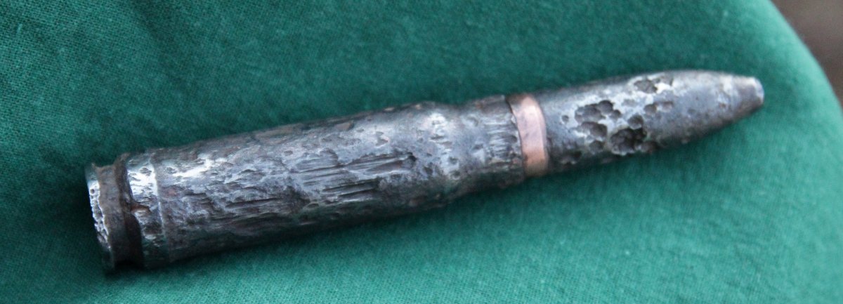 Думаю у Вас 13х64В патрон к крупнокалиберным авиационным пулеметам Германии (МГ 131, МГ 215).. " Одним из интересных патронов, редко встречающихся специалистам, является 13,2мм патрон, использовавшийся во времена второй мировой войны в крупнокалиберных авиационных пулеметах Германии (МГ 131, МГ 215) и Японии (Тип 2). В зарубежной литературе также именуется: 13mmRheinmetall, 13mmMG 131, 13х64. Патрон разработан немецкой фирмой Рейнметалл в 1933 году. Во время второй мировой войны использовался Германией, Финляндией, Италией, Японией и Румынией. После войны Швейцария и Испания производили данный патрон, т.к. имели на вооружении немецкие самолеты. Гильза бутылочной формы, с пояском у проточки фланца, изготовлялась из латуни и из стали с покрытием латунью или лаком. Гильзы первых выпусков имеют стандартный капсюль, далее использовался электрокапсюль. На снарядах имеется ведущий поясок из меди или металла......" http://eko-czao.narod.ru/ball/patron/13-2mmkapg/13-2mmkapg.htm Судя по заключительному фоту в "голове" что-то стоит. На выбор Вам четыре варианта...