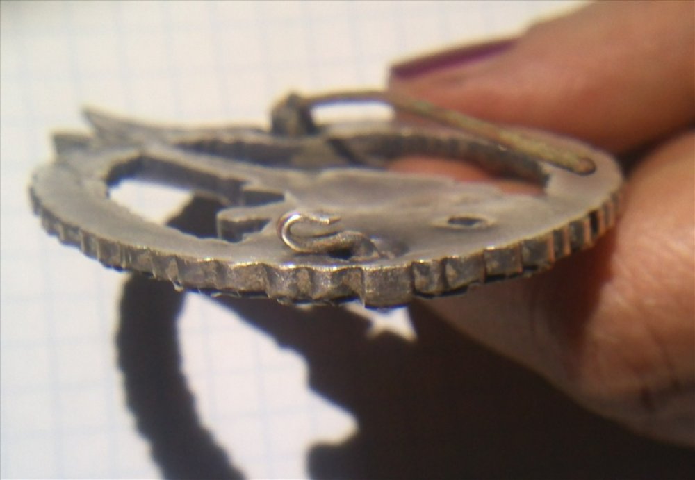 попался на копе,жена выкопала его лично при мне,дома отмыл его от грязи.К стати в описании указан его размер-57х44 мм,а этот вроде больше,может были какие нибудь разновидности?