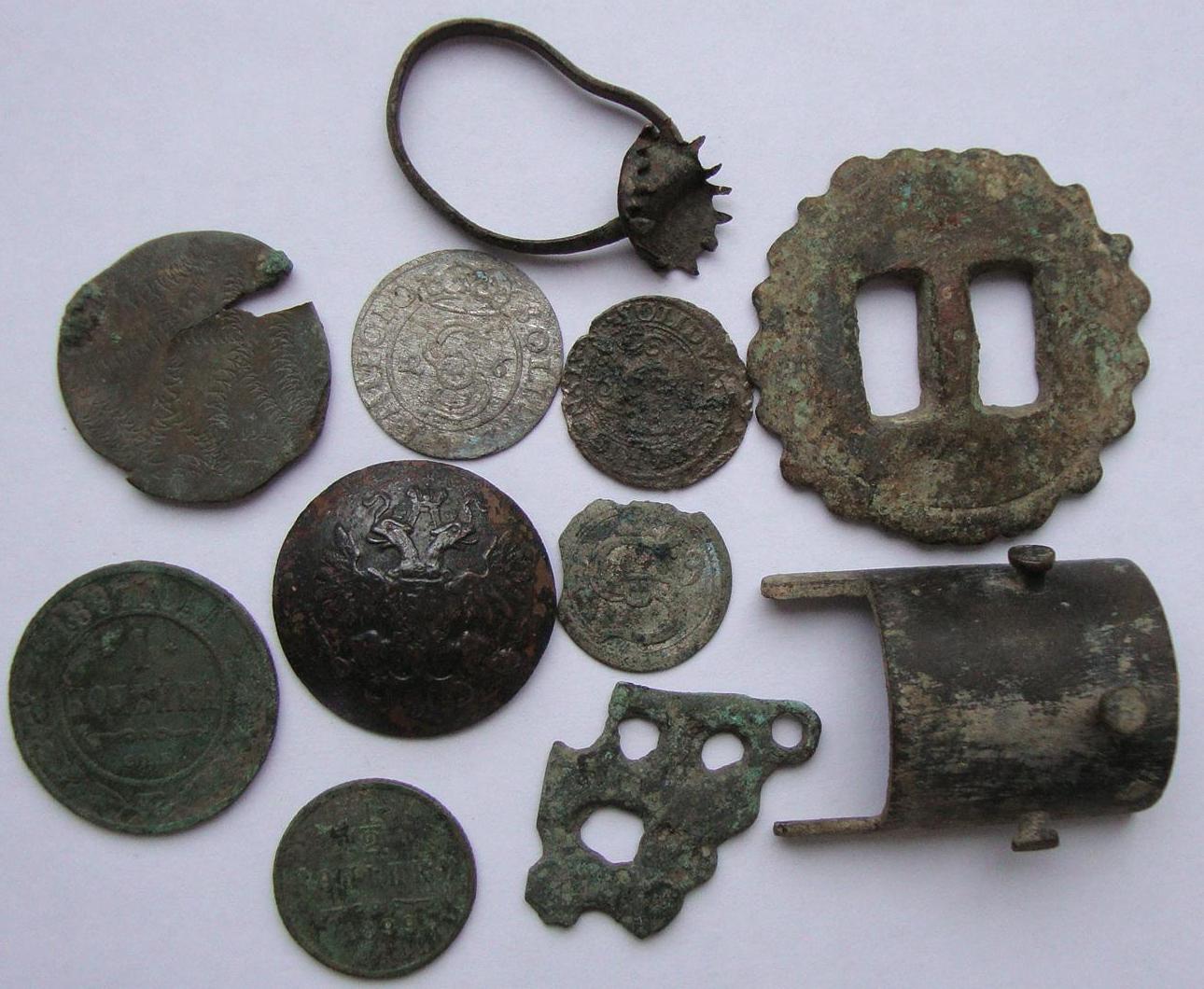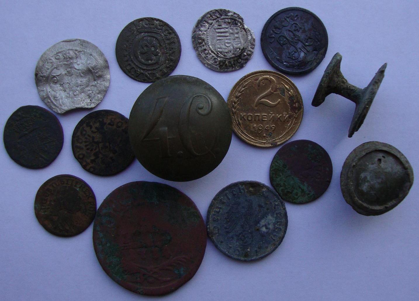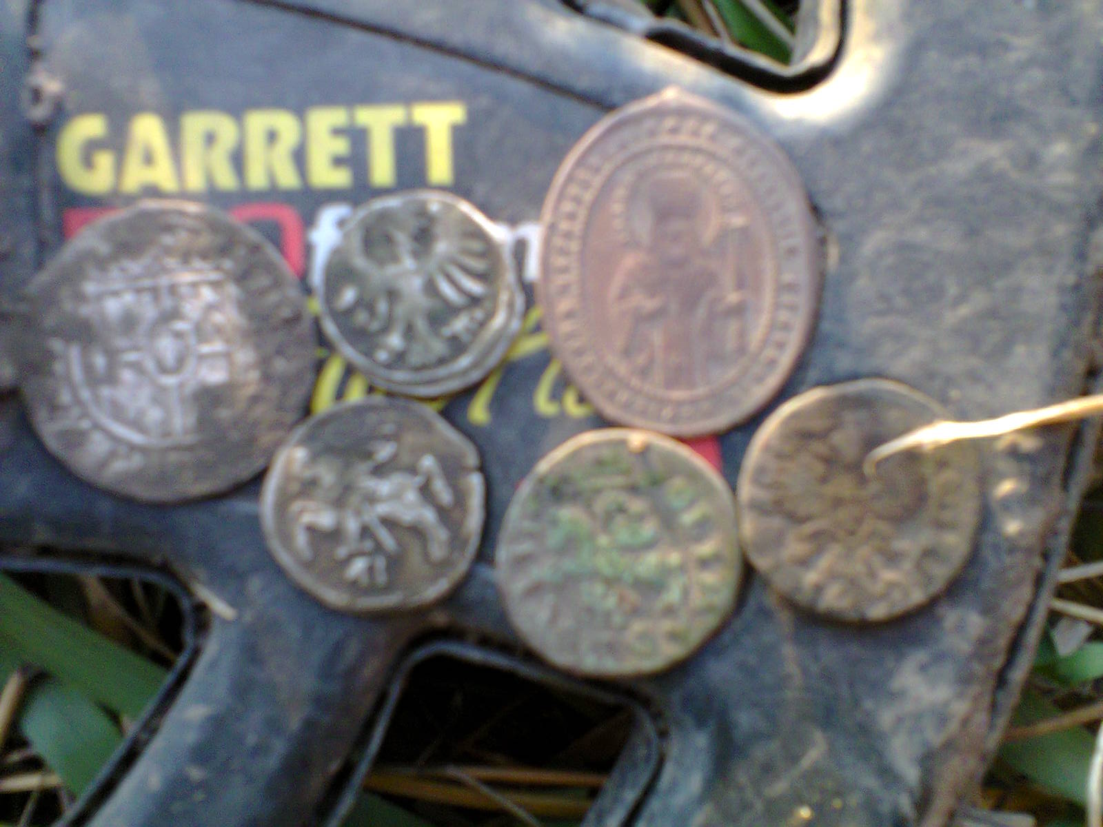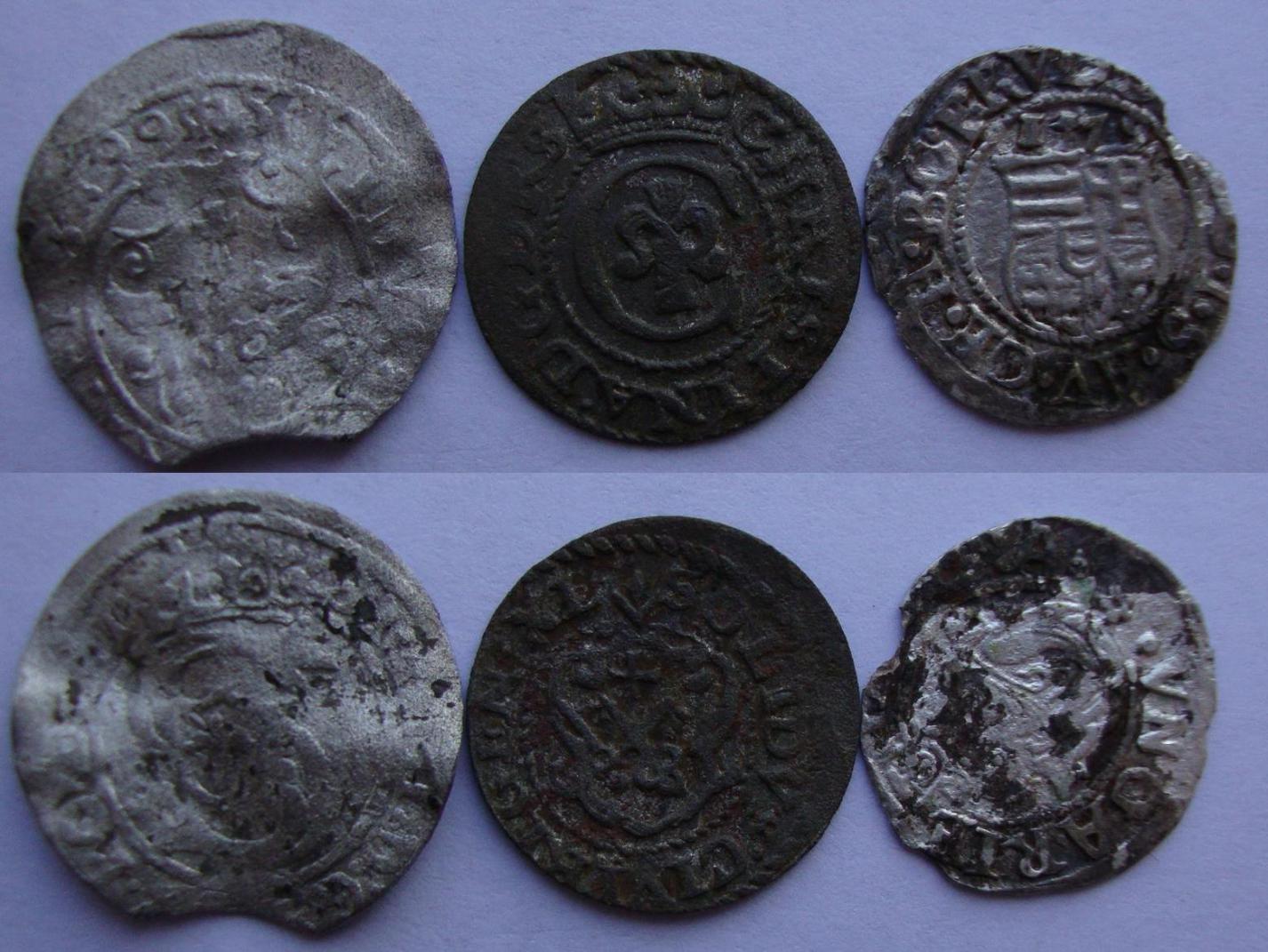 Полтора гроша Сигизмунда 3 - самая большая "серебряная" монета, две боратинки Яна Казимира ( медные монеты), двойной динарий Сигизмунда 2 Августа (средняя "серебряная" монета), а самая маленькая наверное динарий но чей не понятно, с другой стороны смотреть нужно.