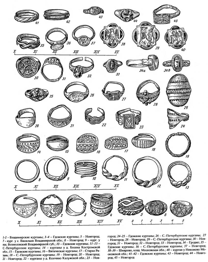 Витые перстни составляют значительную часть общей массы перстней. По количеству проволок, из которых они свиты, их можно разделить на двойные, тройные, четверные (2 х 2), а по характеру оформления концов - на петлеконечные, обрубленноконечные (рис., 35), замкнутые и др. Витые двойные перстни, как замкнутые, так и обрубленноконечные и с заходящими концами (рис., 11), иногда имеют дополнительную сканную перевить (рис., 12). Бытовали они со второй половины XI в., в XII-XIII вв., причем тип этот часто встречается в древностях Прибалтики, Финляндии и Скандинавии, однако известен он и в древностях древлян и полян, северян, дреговичей, а также русских кладах. Иногда в подражание витым перстням изготовляли ложновитые, выполненные литьем в форме, полученной путем оттиска в глине настоящих витых перстней (рис., 18, 41). Датируются эти украшения широко: от начала XI до XV в., следовательно, они не могут быть определяющим типом. Плетеные перстни сплетены из нескольких проволок. Выделяют два основных варианта плетеных перстней. К первому относятся перстни с массивной плетеной из четырех или шести проволок средней частью и гладкими сомкнутыми концами (рис., 13). Судя по новгородским аналогиям, эти перстни бытовали от середины XII - до середины XIV в. Ко второму варианту относятся перстни, целиком сплетенные из семи тонких проволок (рис., 19). В Новгороде такие перстни встречены в слоях конца XII - второй половины XIII в. Известны плетеные перстни обоих вариантов в древностях смоленских и владимирских кривичей, новгородских словен и витячей, а также полян, древлян и северян. С уважением GINDENBURG.