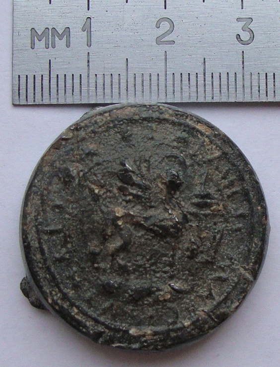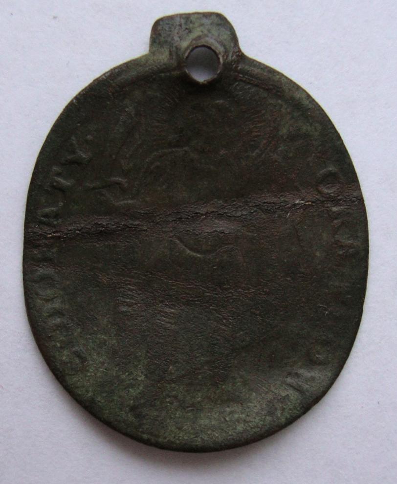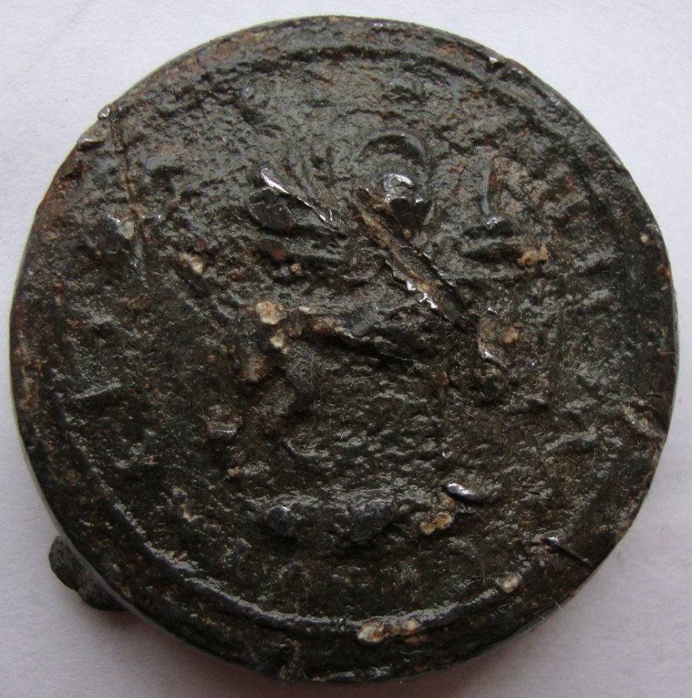 Твою мысль понял сразу правильно. Думал про одно - написал другое... Кстати там же был найден согнутый пополам медальончик. К моему удивлению при разгибе он не тресну, а лишь слегка "скинул" патину. Латинские буквы напоминают буквы с польских монет 17-18 века. Просьба помочь с датировкой медальона, а так же с его «сюжетом». Заранее благодарен. С уважением GINDENBURG. Пы.Сы. В реале рисунок видно лучше, чем на фото.
