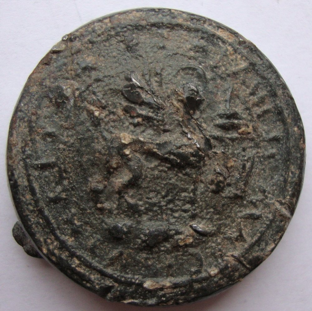 Это не кентавр, а лев с нимбом и крыльями - герб Венеции, с итальянской круговой легендой. Возможно крышка какая-нибудь с бутыли придела 17-18 ст.....покопайтесь по нету, может че и найдете .