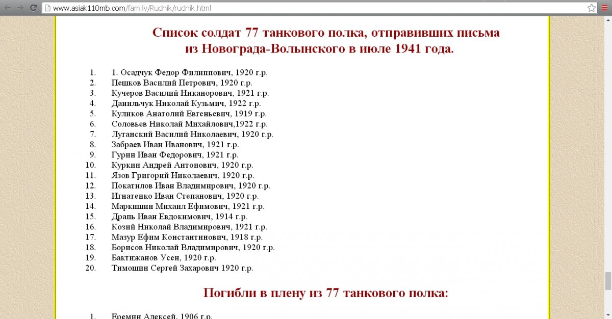 Добрый вечер! Нашла интересную статью о трех братьях Мордко, Михаиле и Ефиме Рудниках (http://www.asiak110mb.com/family/Rudnik/rudnik.html). В статье "засветился" Осадчук Федор Филиппович. Последним местом службы Осадчука Ф.Ф., согласно п/я 257/1 - был 77 танковый полк в составе 39 танковой дивизии 16 мехкорпуса. Он там упоминается в первой строке списка солдат этого полка, которые отправили письма из Новоград-Волынского в июле 1941 года.