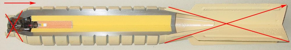 Ну по первому фото вроде "понятка". Очень СИЛЬНО тянет на корпус от немецкой АБ SD-10C без головной части (см. фхему № 2 - отмечен стрелками стык) и хвостового оперения. Фото со стороны головной части. По второй непонятке - думаю.