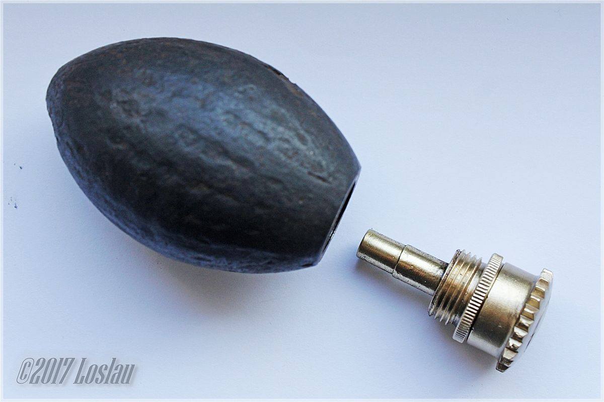 Приветствую. Вот такая штука попала мне в руки. Вроде как граната. Найдена по зиме 42-43 на позициях. Длинна 8 см, диаметр 5,5см, отверстие 1,8 см. с мелкой резьбой. По внутренним стенкам насечка квадратиками по 5 мм. Подскажите пож-ста. Спасибо.