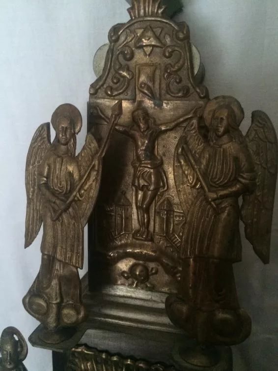 пруф на сцену з вашим Гавріїлом я на жаль не маю - це важливо, так як від того, що він тримає в руках , залежить сцена і його оточення. так один з варіантів : алтар - престол як його центральна частина - дарохранительниця -сюжети. один з відомих сюжетів - поклоніння Хресту Животворящому. тут архангел Гавріїл та архангел Михаїл. в руках знаряддя Страстей Господніх. ще один сюжет - у Гавріїла квітуча гілка по вашому Гавріїлу , на мою думку, сюжет Благовіщення з Дівою Марією. можливі також інші варіанти.