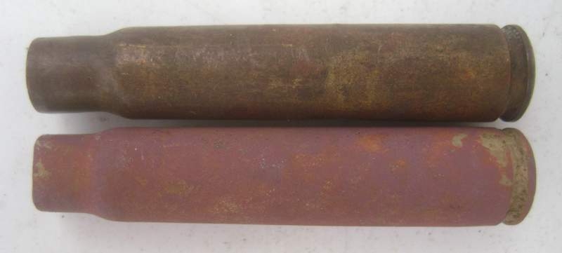 Слева: похожий по "вздутости", но не отстрелянный образец на базе гильзы 7,92х57; справа: отстрелян из чего-то 9,3мм-го.. возможно из 9,3х57, а может и с большей гильзой. Тут гадать можно до бесконечности, что мы делать не будем.