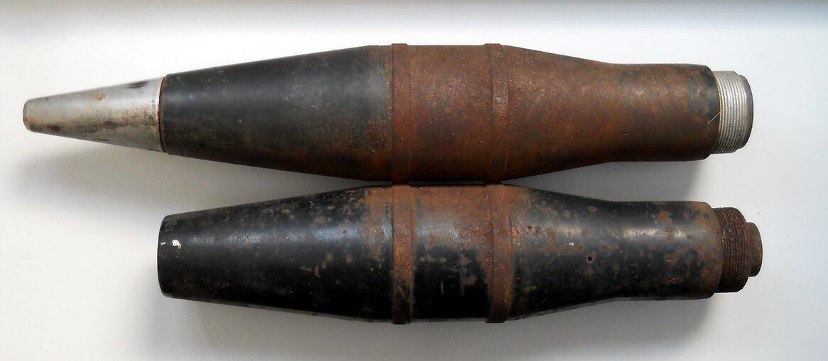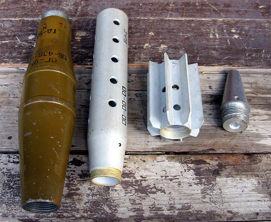 Добрый день. Немного "поворчу". ЭТА конкретная голова вряд ли применялась или планировалась для СТРЕЛЬБЫ. На фото №1 ТС отлично видно остатки ЗЕЛЕНОЙ окраски корпуса. Т.е. мы имеем в первом приближении как-бы ранее боевую веСЧь. Но я не верю,что боевую ГЧ , снаряженную ВВ, распотрошили. Следовательно у ТС - головная часть от УЧЕБНОЙ (легко разбирающейся) осколочной гранаты, предназначенной для ОБУЧЕНИЯ личного состава, а не стрельбы. Для стрельбы идут инертные гранаты (как сказано выше), имеющие ЧЕРНУЮ окраску корпуса. Ну и макет - красную. Все образцы на фото ниже.
