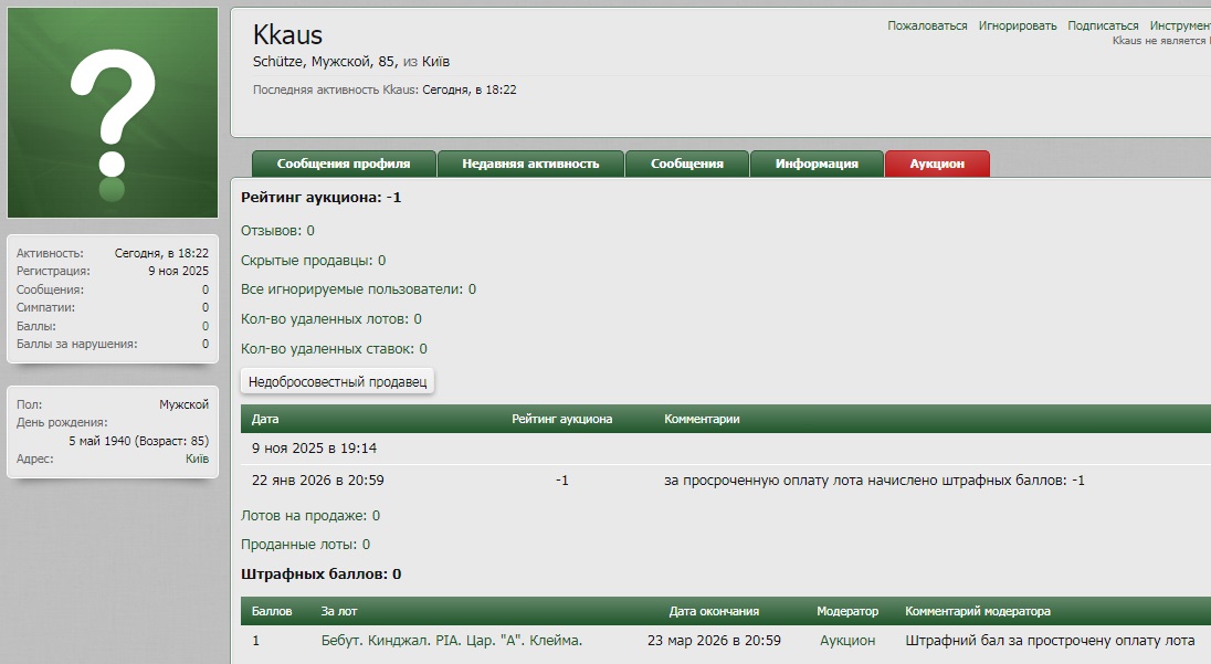 Доброго здоровя. Питання до адмістрації. Чому після НЕвикупів у мене, покупець залишається без попередження. Я не злопамятний, але це тоді буде бардак. https://reibert.info/lots/bebut.-kindzhal.-ria.-car.-a-.-kleyma..1619042 Ну і кнопочки "диспут" в мене чомусь нема. Дякую.