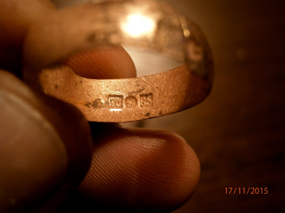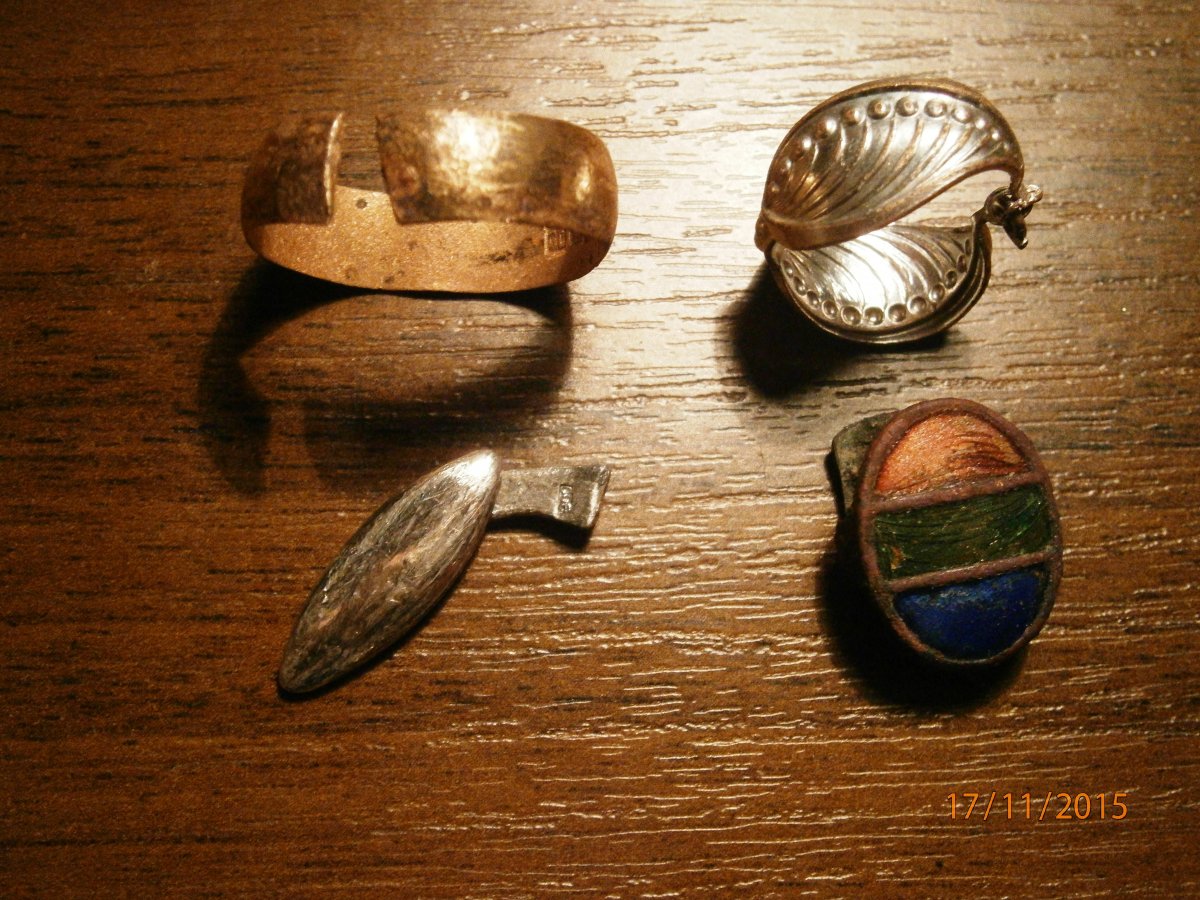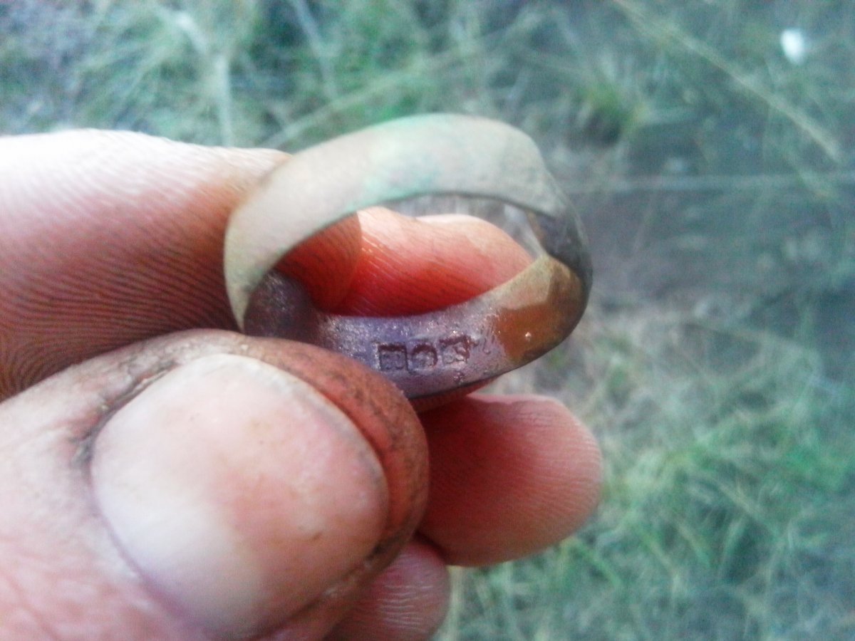 Дождь не идет, надо на коп. Калиновка наконец то порадовала. Дома почистил. 1.Запонка серебро. 2.Похоже на серьгу серебро, но не уверен что серьга. 3.Прищепка разноцветная, не знаю что такое, раньше не встречал. 4. Самое интересное обручалка, что за металл не пойму похоже на латунь,зачем проба тогда, почистил чуть чуть вроде золото, буду разбираться.