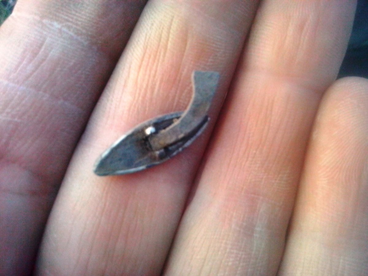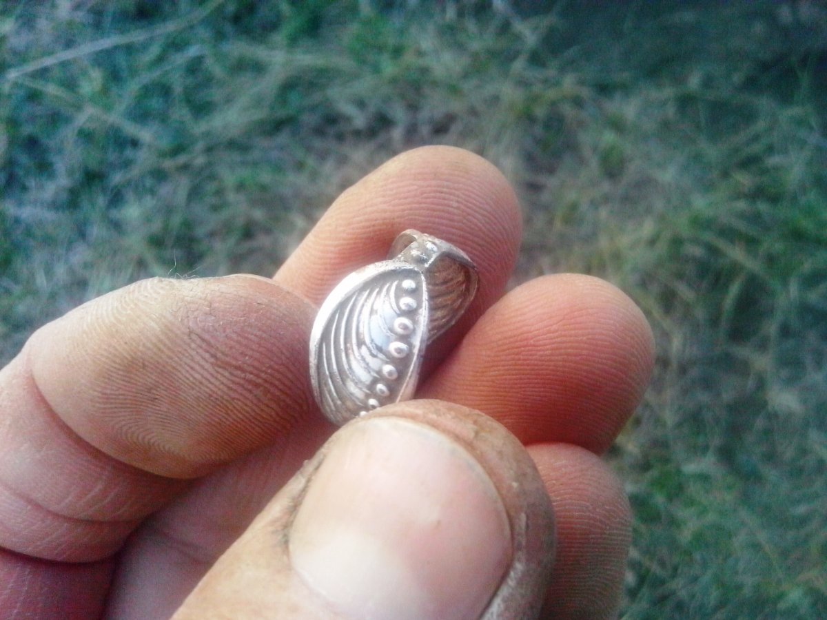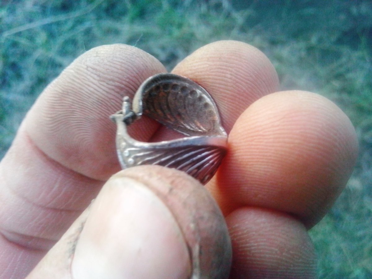 Дождь не идет, надо на коп. Калиновка наконец то порадовала. Дома почистил. 1.Запонка серебро. 2.Похоже на серьгу серебро, но не уверен что серьга. 3.Прищепка разноцветная, не знаю что такое, раньше не встречал. 4. Самое интересное обручалка, что за металл не пойму похоже на латунь,зачем проба тогда, почистил чуть чуть вроде золото, буду разбираться.